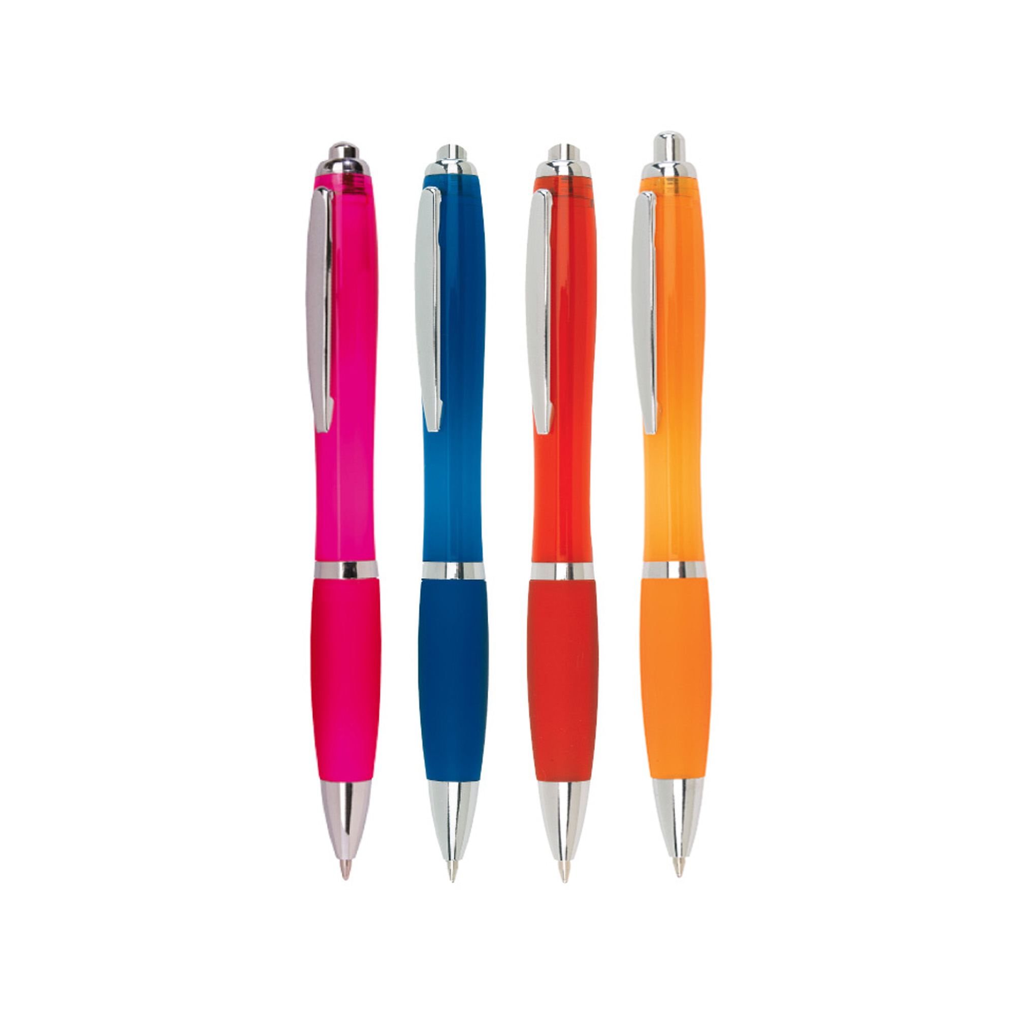 Plástico. Cuerpo curvo. Pulsador, clip, puntera y detalles en color plata. Grip de goma de color. Retráctil. Tinta negra.