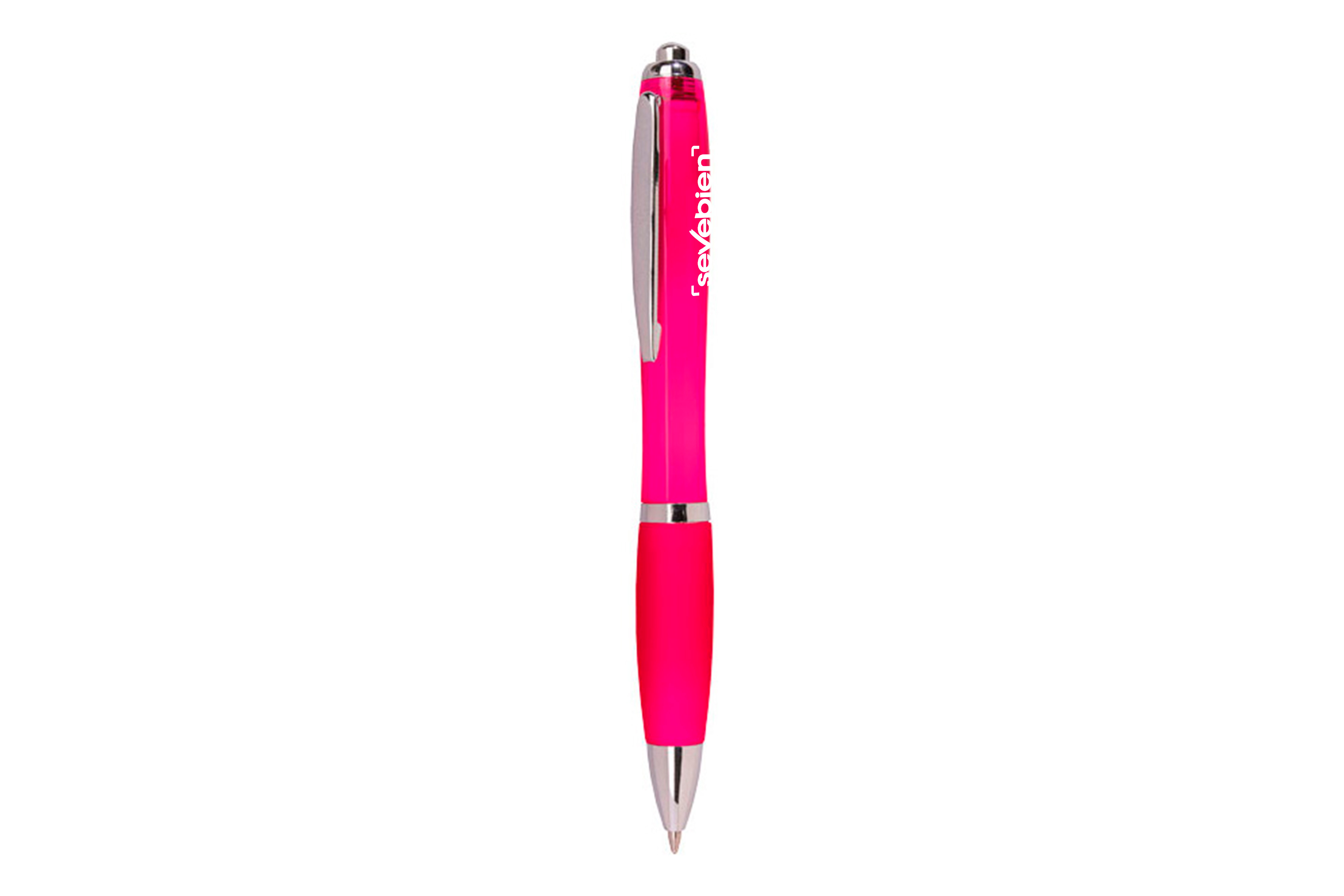 Plástico. Cuerpo curvo. Pulsador, clip, puntera y detalles en color plata. Grip de goma de color. Retráctil. Tinta negra.