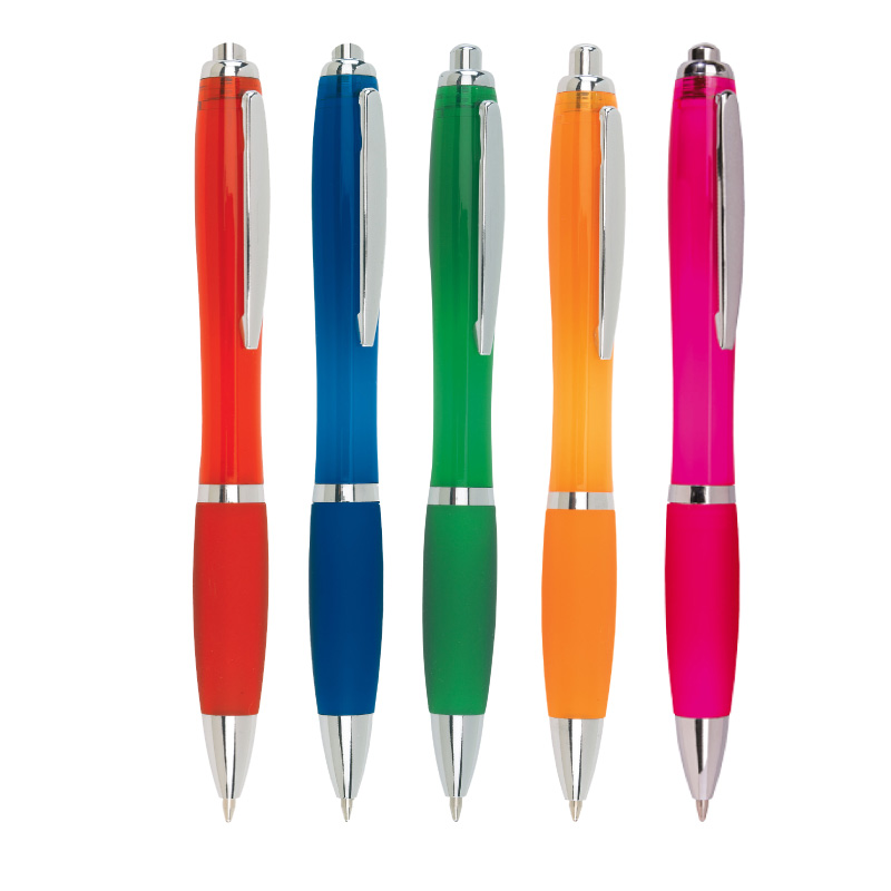 Plástico. Cuerpo curvo. Pulsador, clip, puntera y detalles en color plata. Grip de goma de color. Retráctil. Tinta negra.