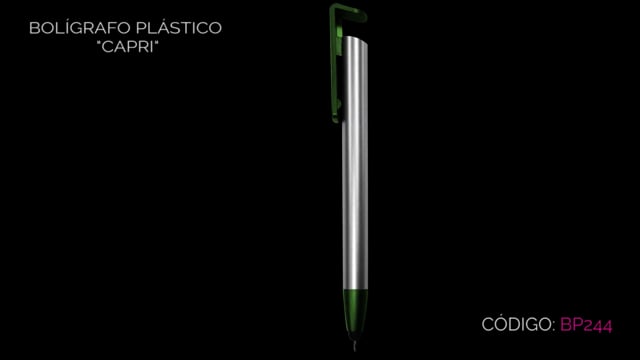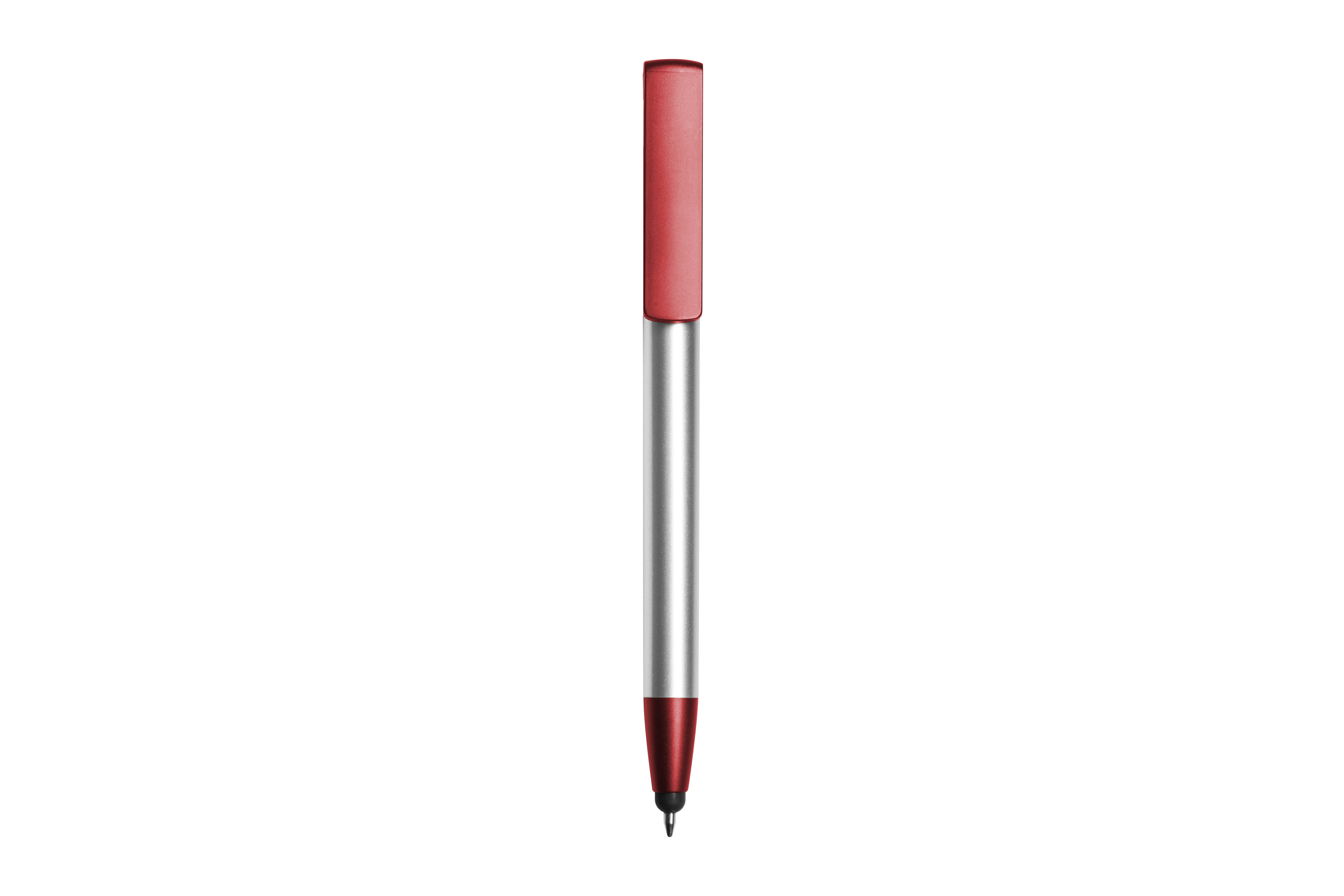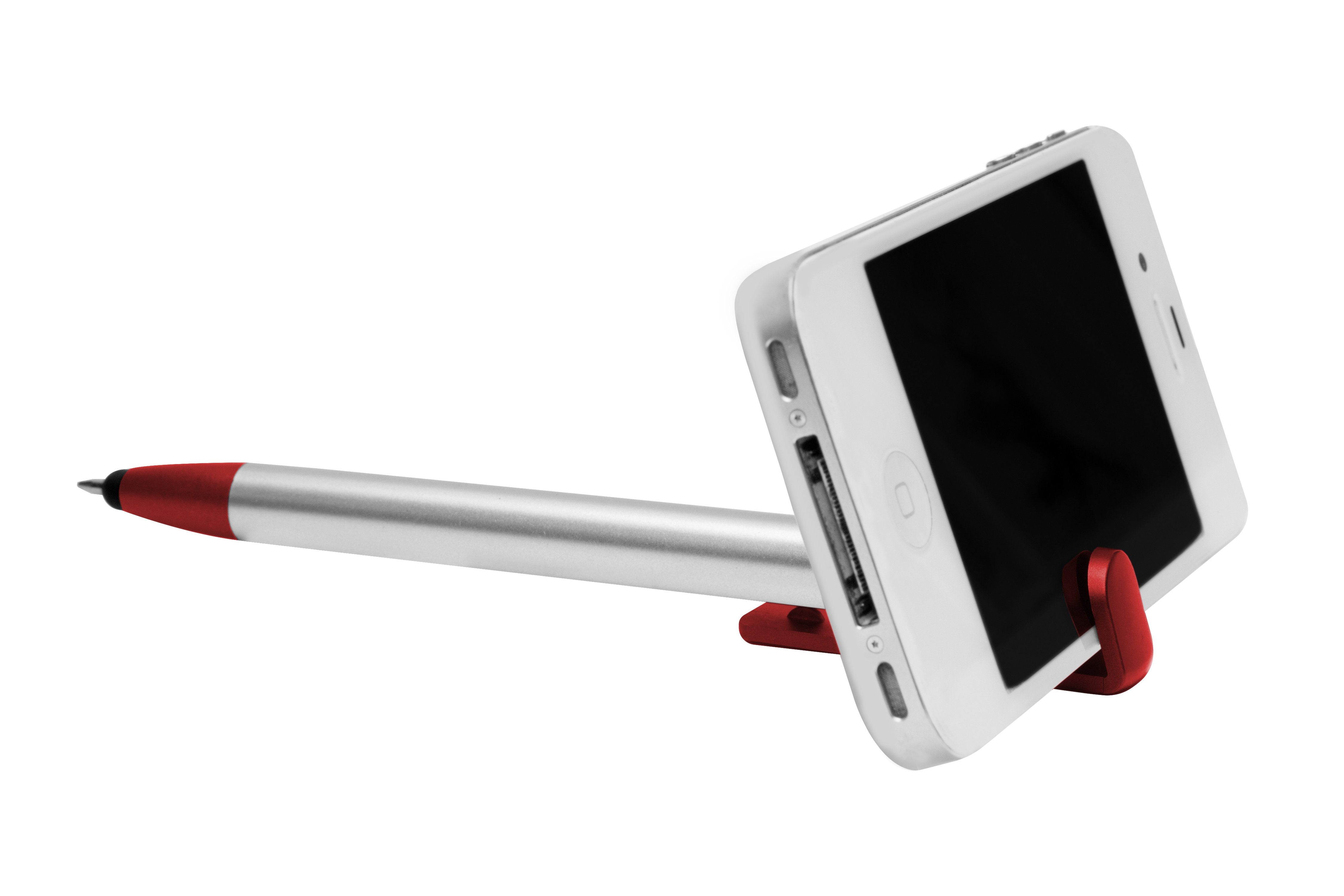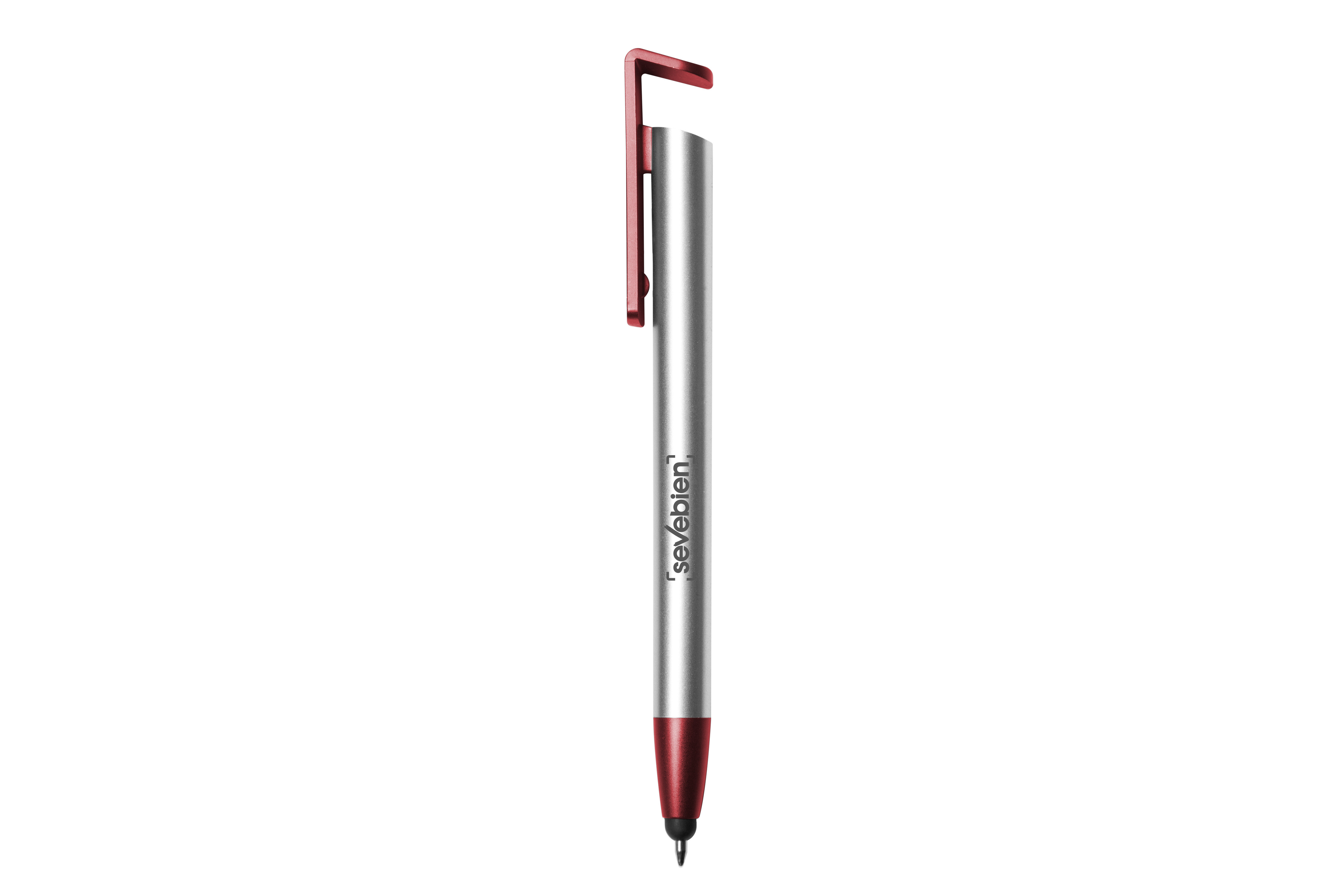 Bolígrafo. Plástico. Cuerpo plástico plateado y detalles de color. El clip tiene un ranura que funciona para soporte de celular. Puntera touch.