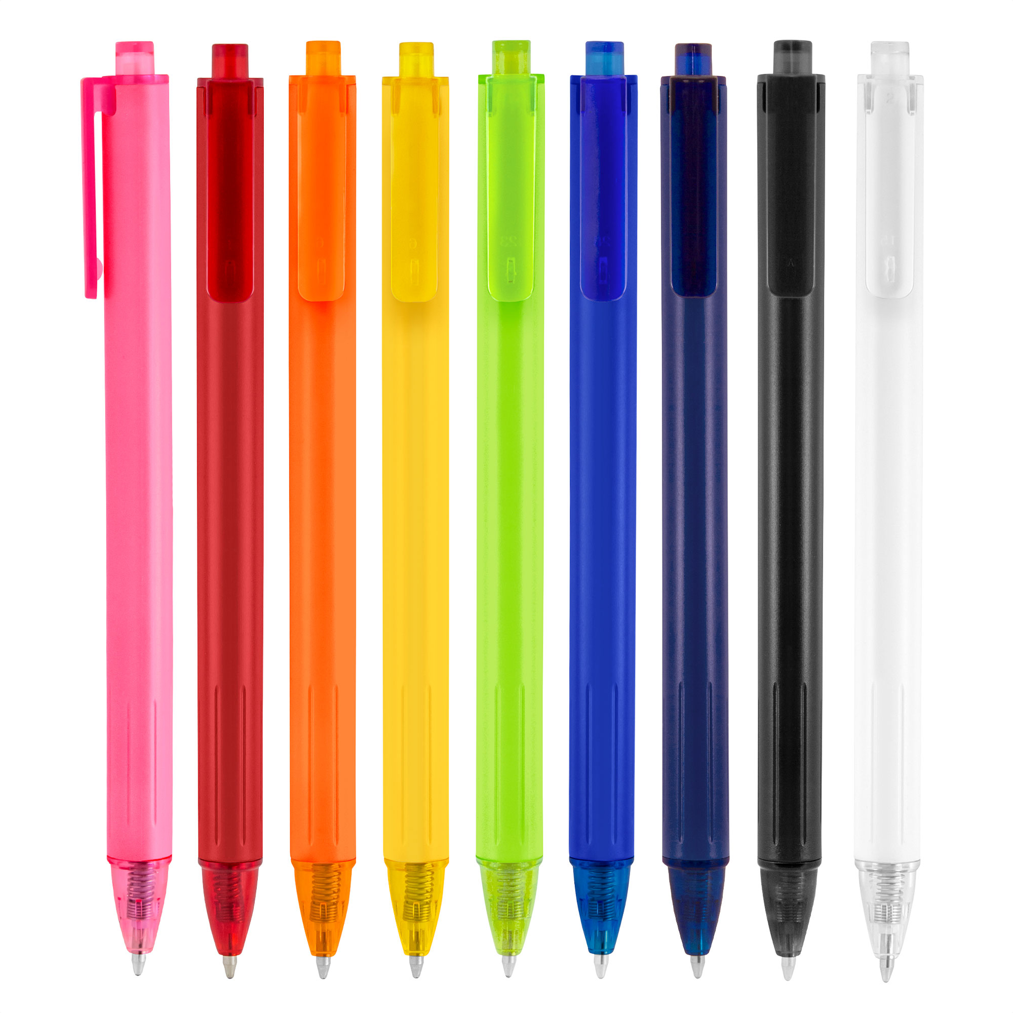 Bolígrafo retráctil. Cuerpo de diferentes colores acabado mate. Pulsador, clip y puntera translucidos del mismo color del cuerpo.