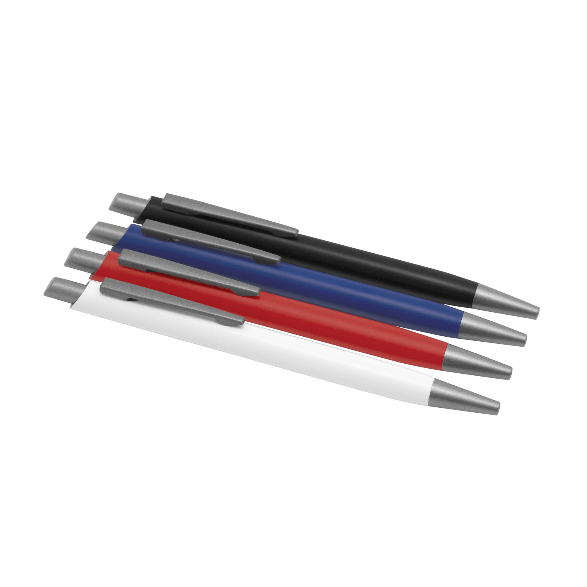 Aluminio, ABS, Acero. Boligrafo retráctil. Cuerpo revestido en laca de diferentes colores. Acabado mate. Pulsador, clip y puntera de color gris gun metal. Tinta negra. Amplia área de impresión.