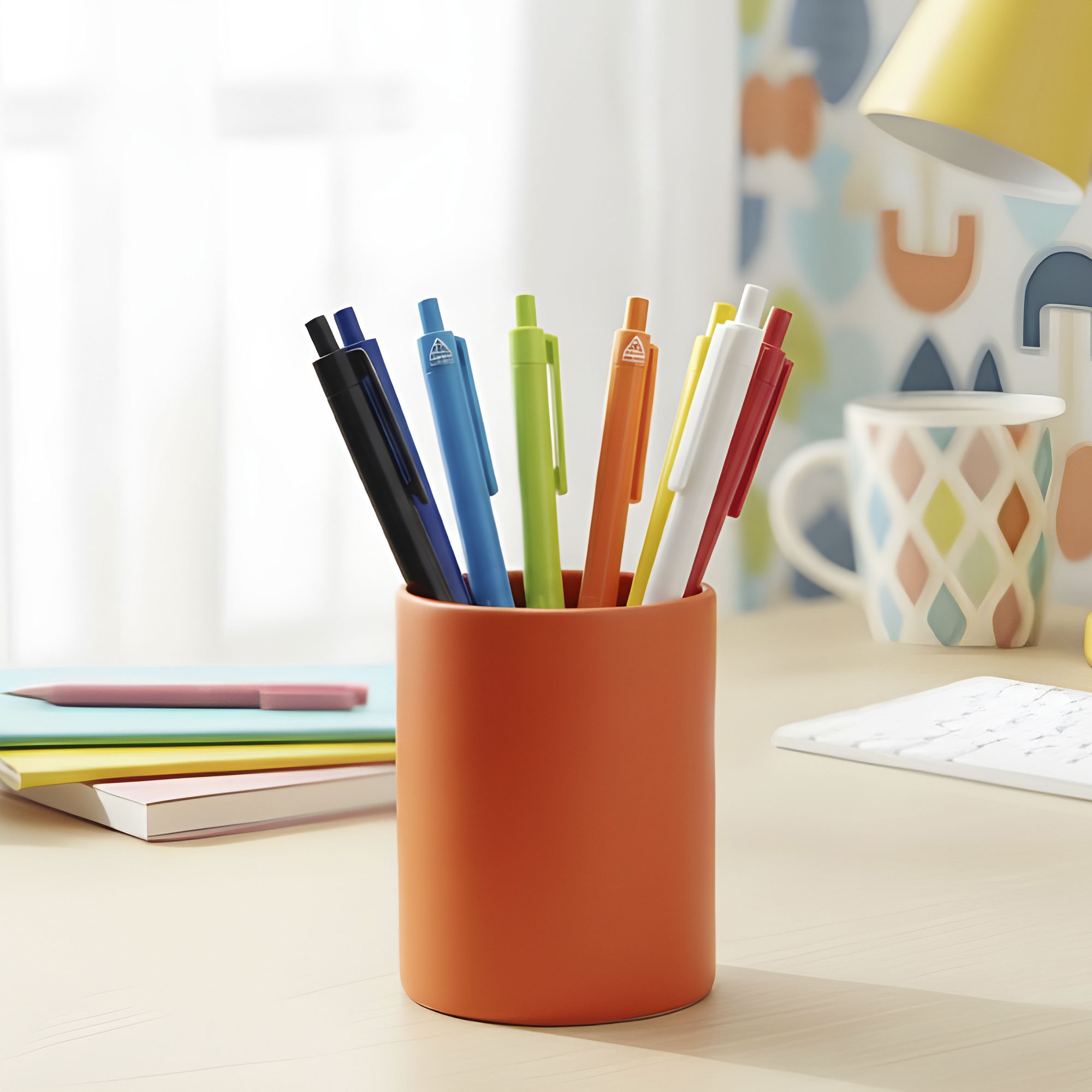 Bolígrafo retráctil. Cuerpo de diferentes colores. Acabado mate. Pulsador, clip y puntera del mismo color del cuerpo.