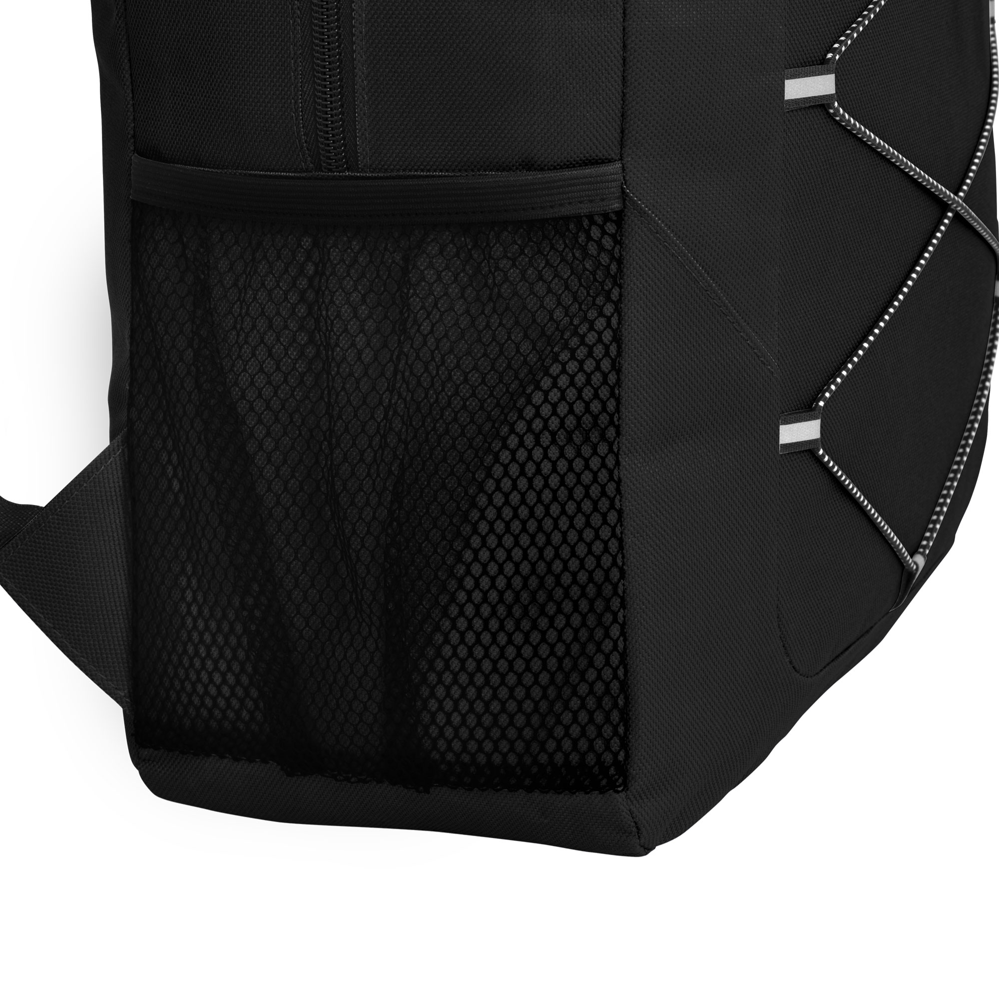 Mochila outdoor. Compartimento principal con doble cierre. Bolsillo frontal con cierre, cordón elástico cruzado ajustable y un bolsillo de red lateral para transportar botellas. Detalles reflectivos. Cierres metálicos con tiradores de goma. Correas regulables y espalda acolchadas.