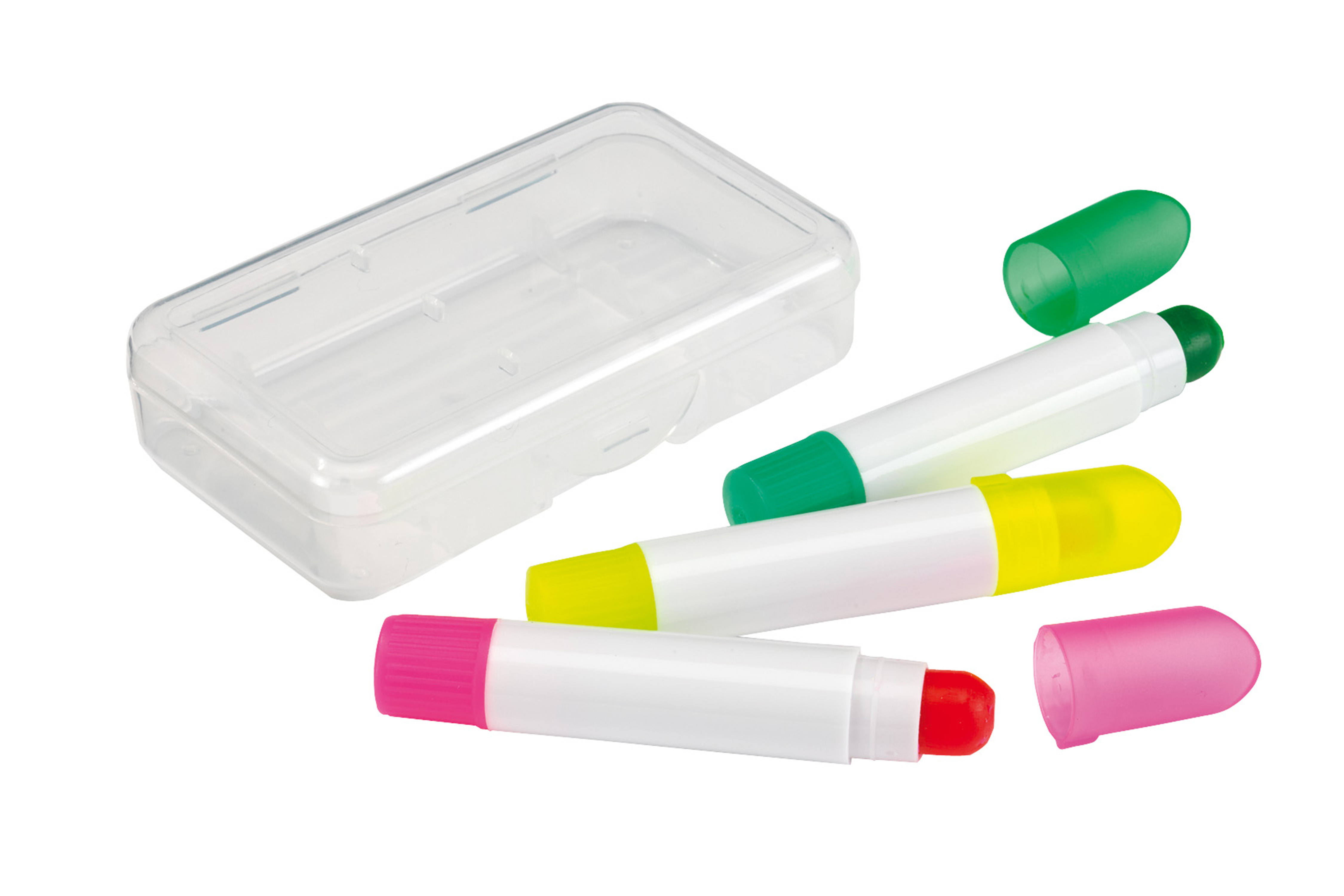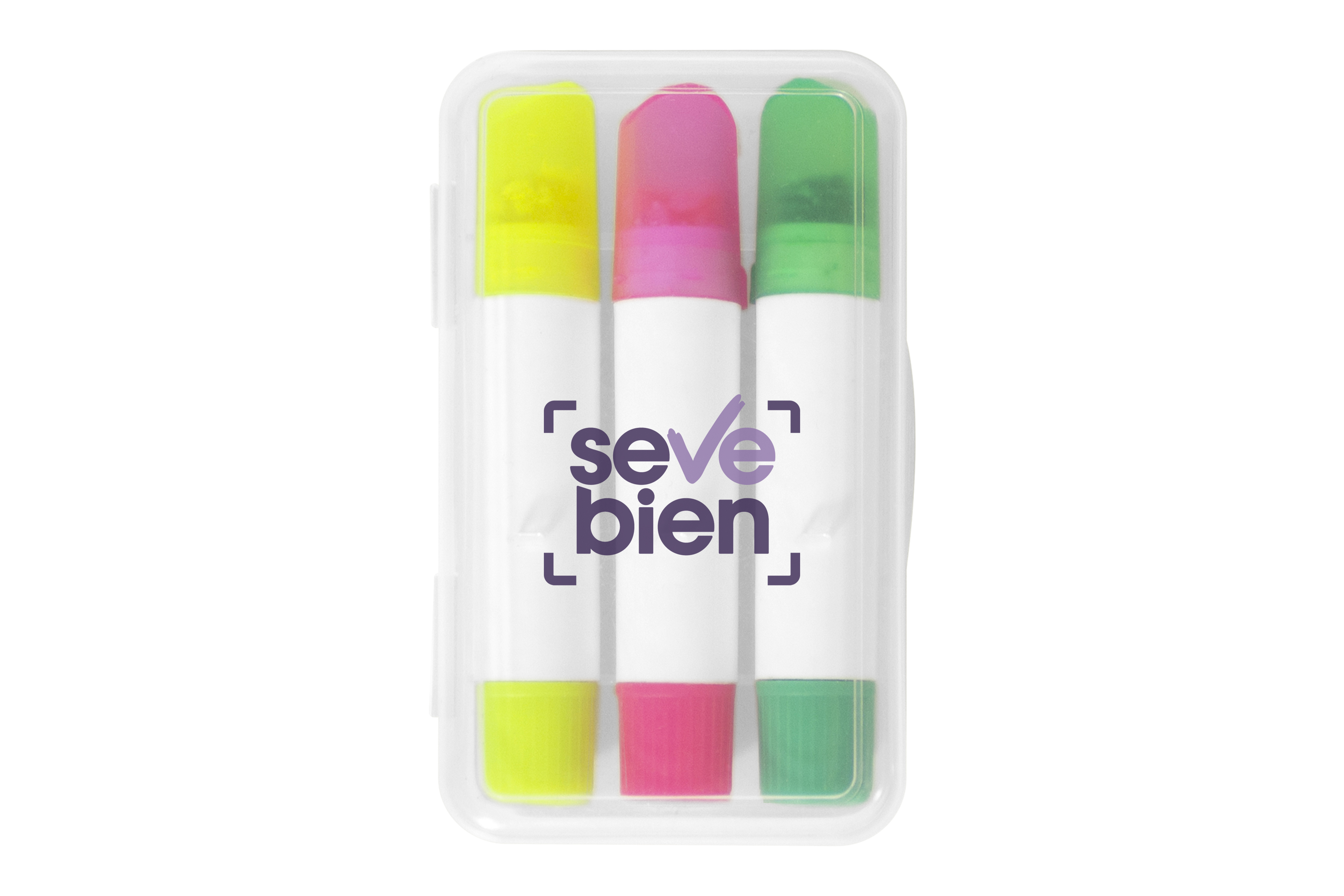 8,5 x 2 x 5 cm. Plástico. Set de 3 resaltadores de cera. Estuche plástico transparente.