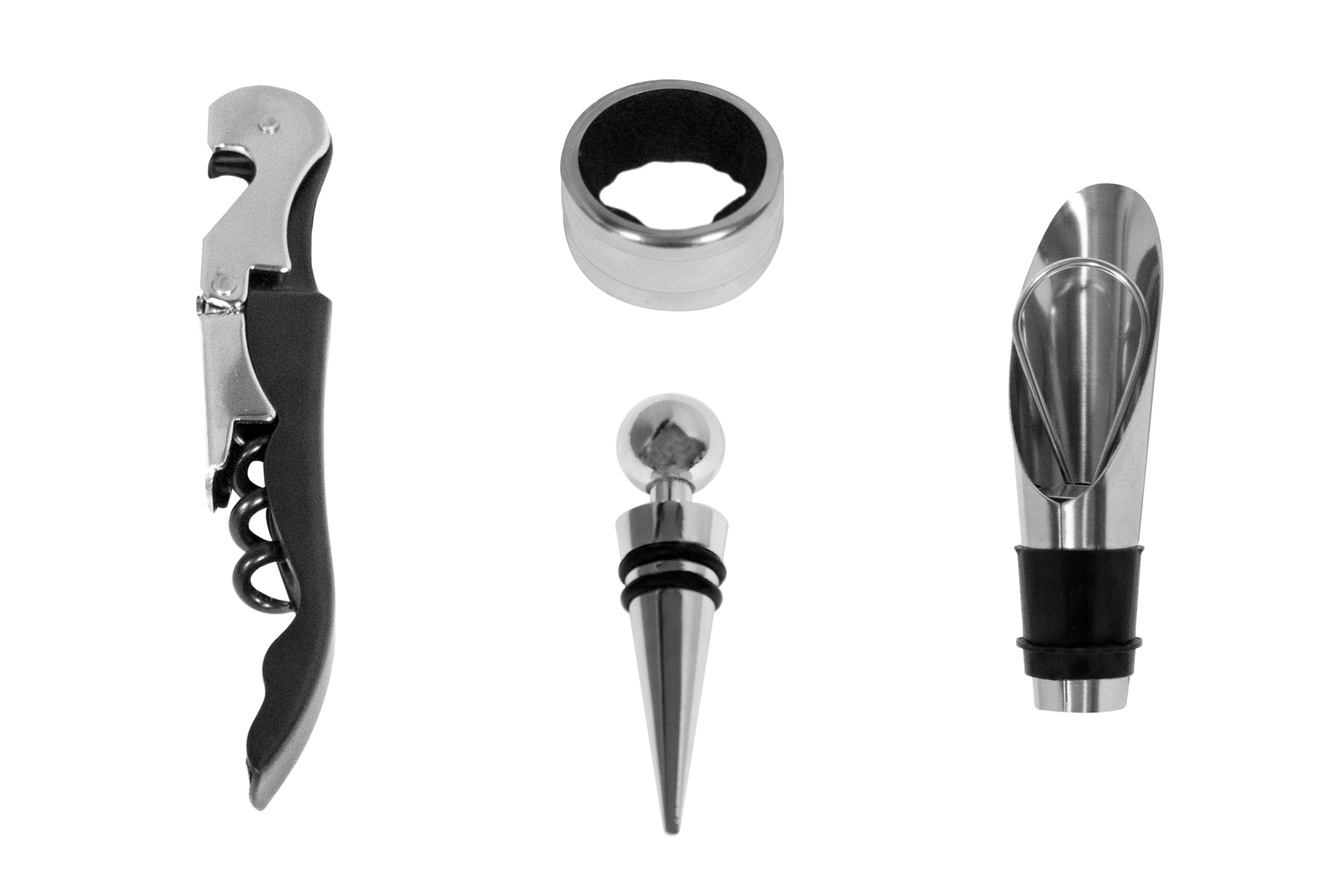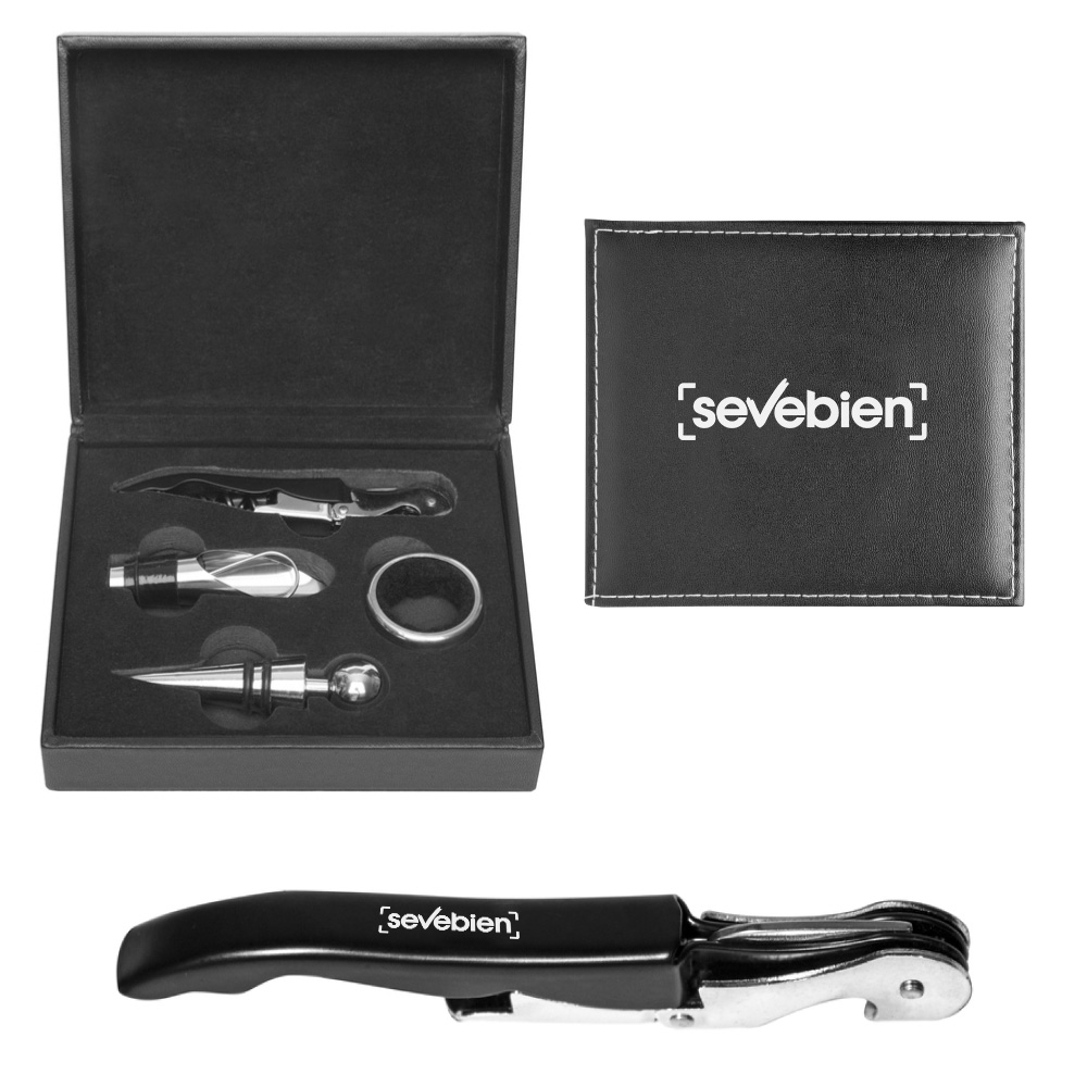 16 x 14 x 5 cm. Simil cuero. Accesorios para vino en estuche de simil cuero. Cuenta con sacacorcho, anillo antigoteo, tapón y vertedor. Presentación en caja de regalo.