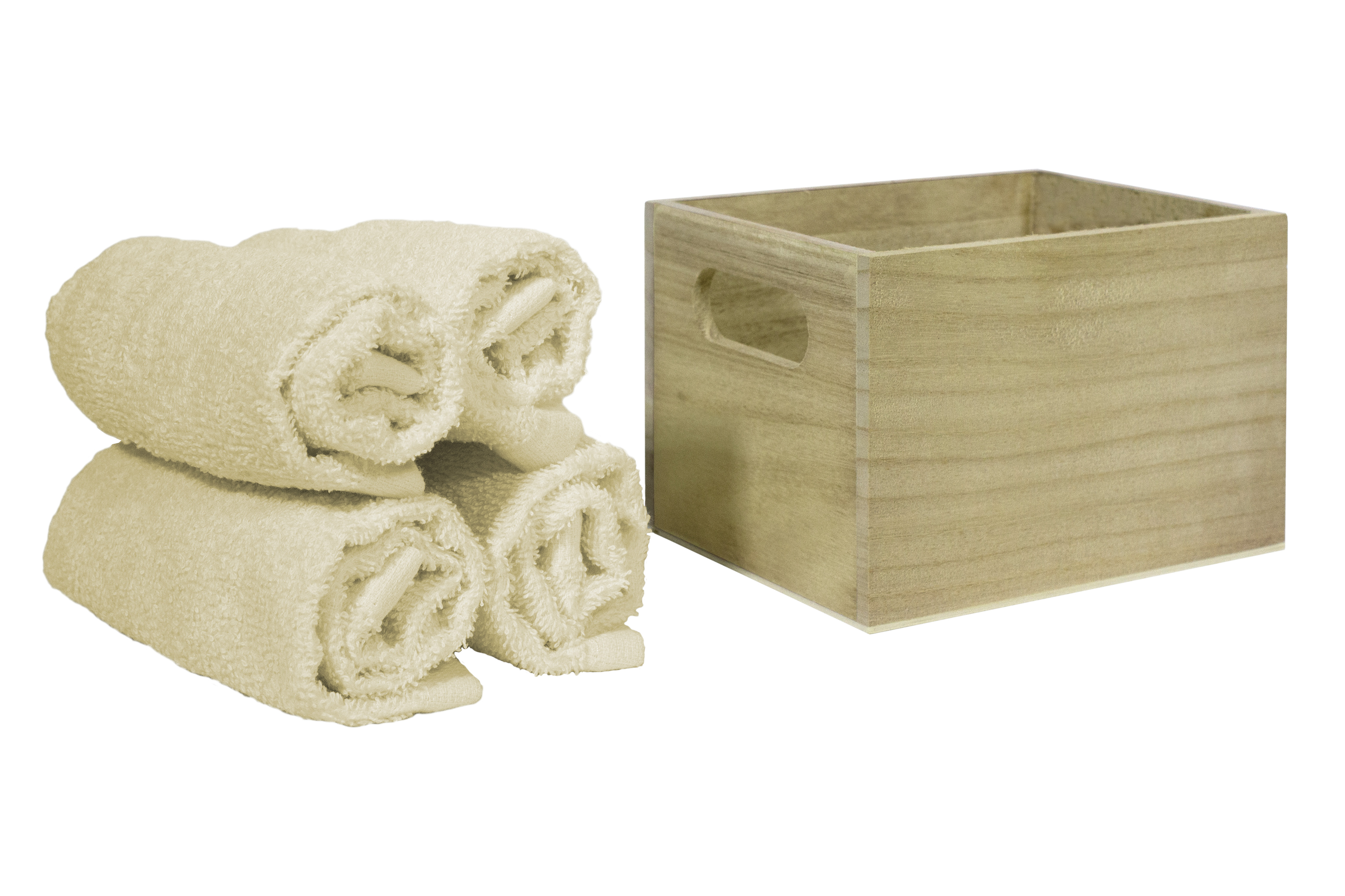 Toalla: 30 x 30 cm. Caja: 14,1 x 11,1 x 9,6 cm. Algodón y madera. Set de 4 toallas de mano en caja de madera.