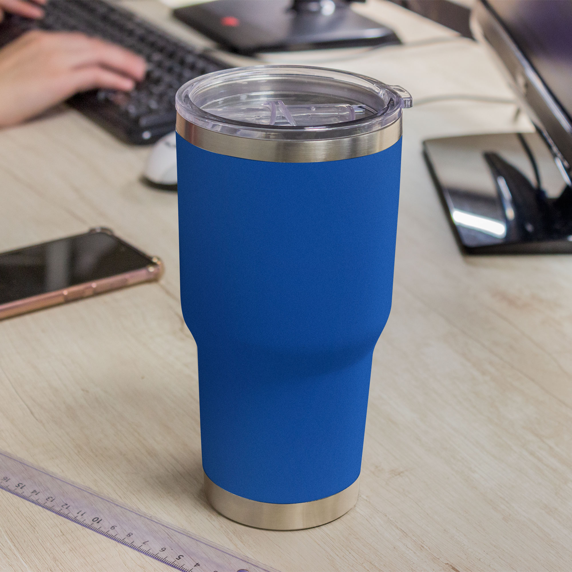 Ø 10 x 20 cm. Capacidad 850 ml. Acero Inoxidable. Mug doble pared sellado al vacío. Tecnología Vacuum. Interior en acero 304 y exterior en acero 201. Pintura Powder Coat (pintura mas duradera y resistente a la corrosión y el paso del tiempo). Tapa plástica transparente a presión con anillo de silicona.. Mantiene las bebidas frías o calientes por más tiempo. Presentación en caja de regalo.