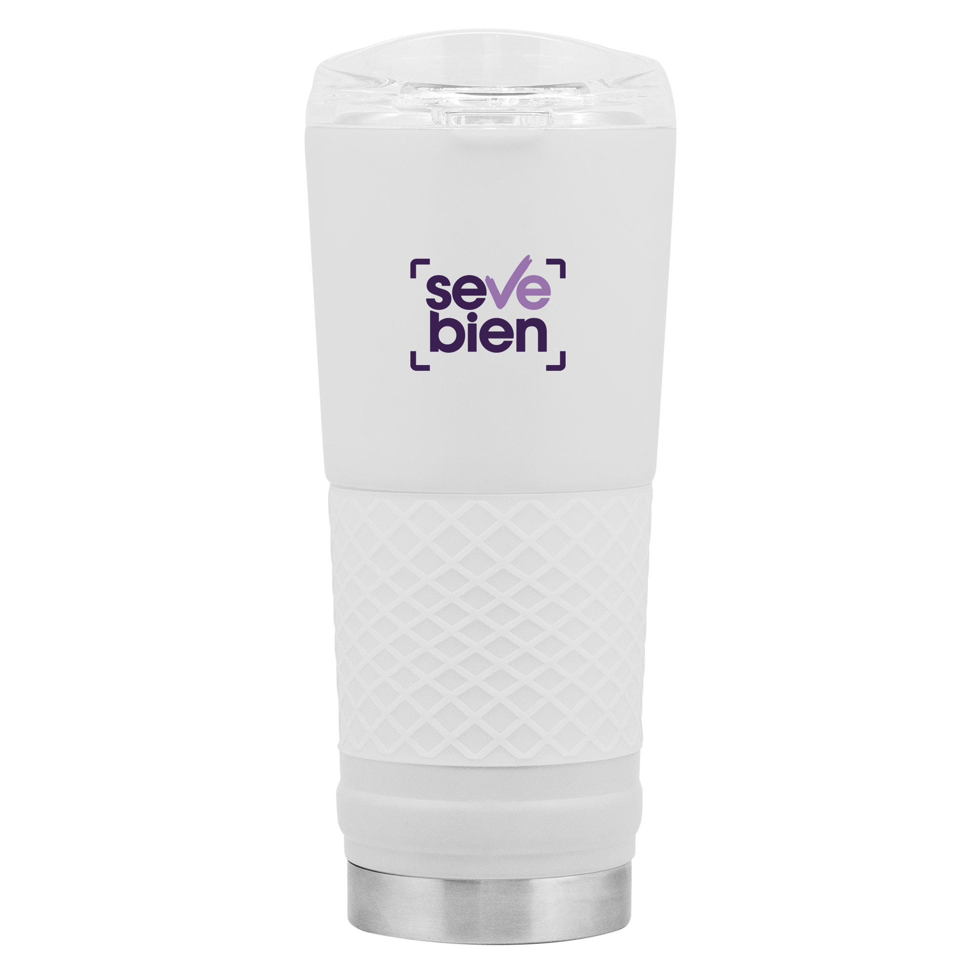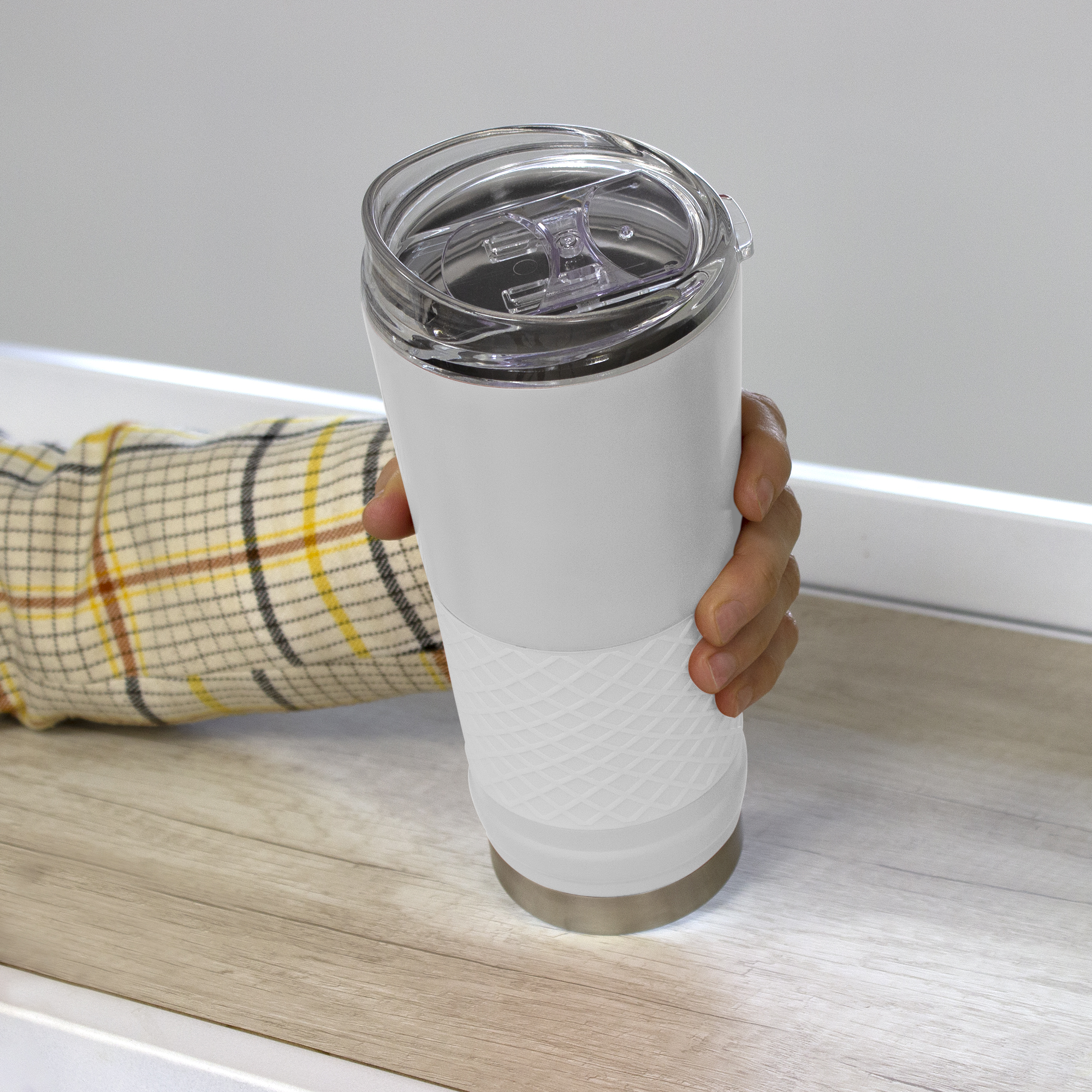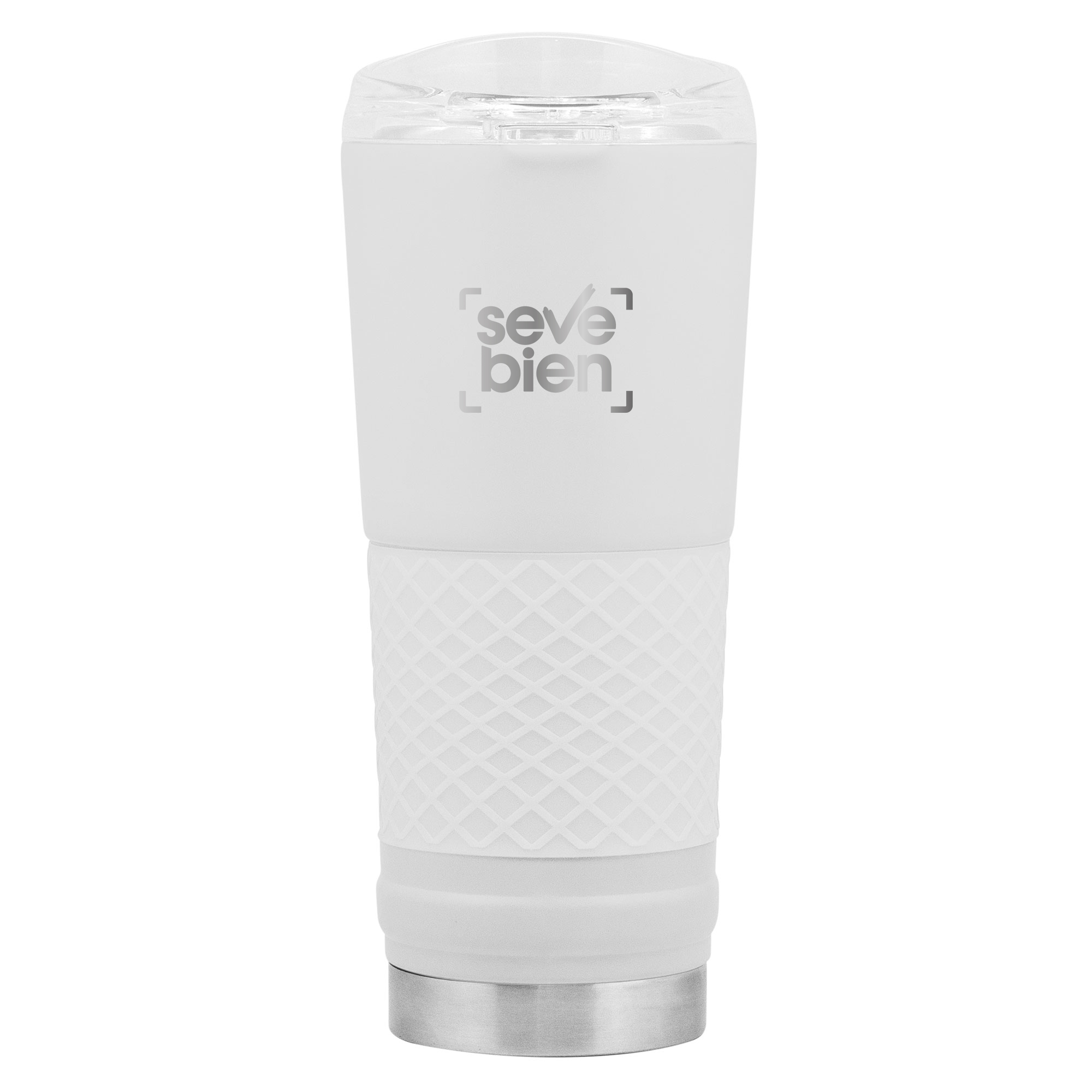 Ø 8,5 x 23 cm. Capacidad 720 ml. Acero inoxidable. Mug doble pared. Interior en acero 304 y exterior en acero 201. Manga antideslizante de silicona. Tapa plástica transparente a presión con anillo de silicona. Presentación en caja de regalo.