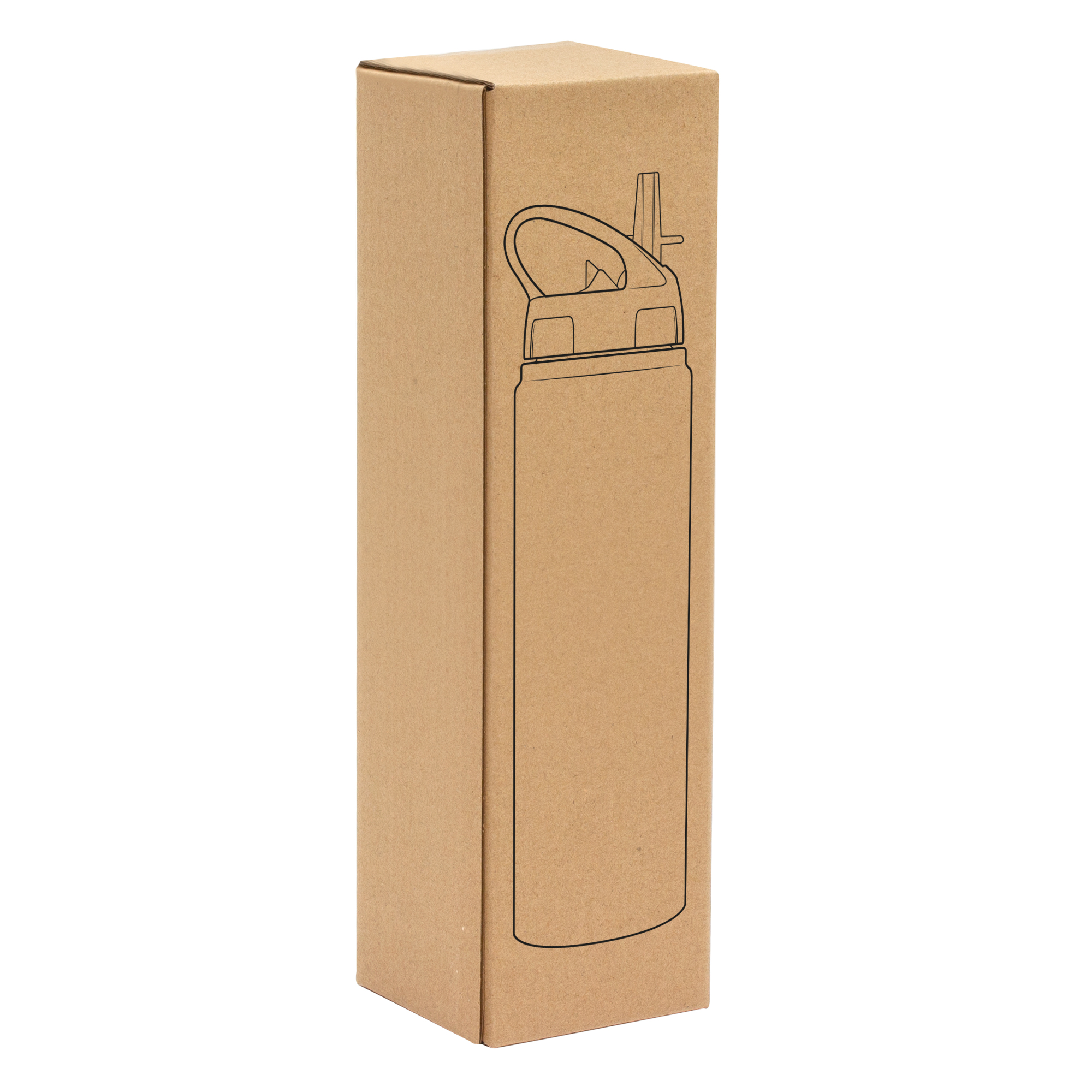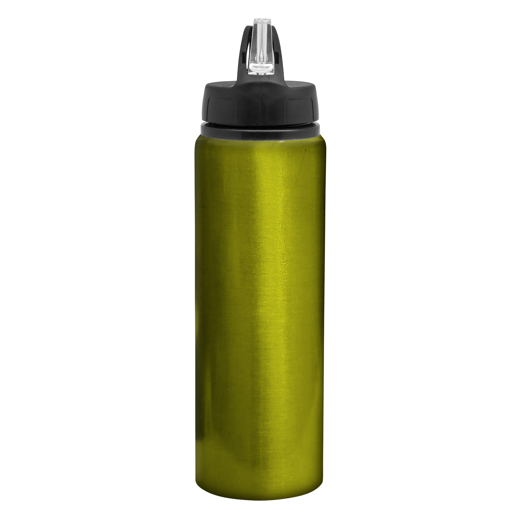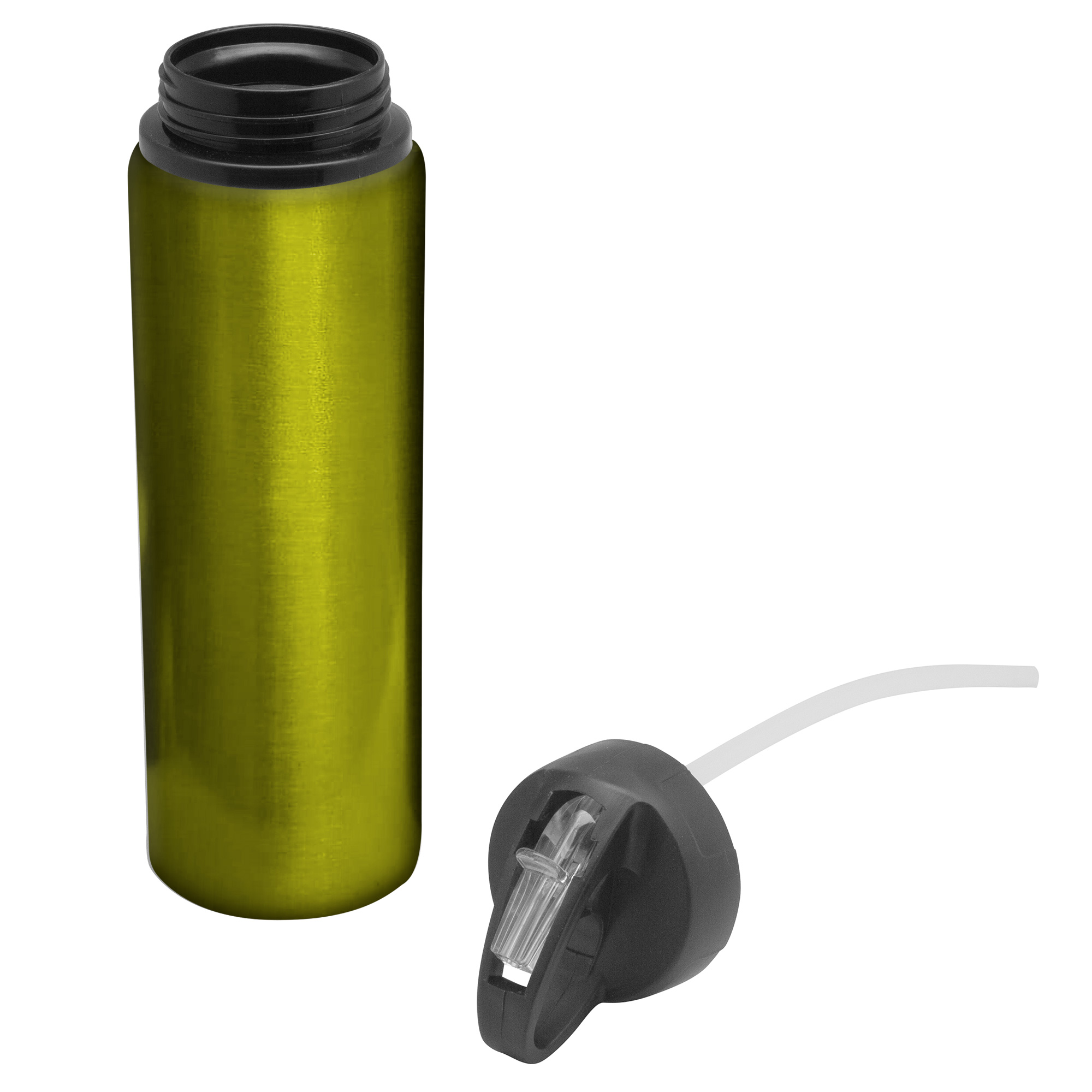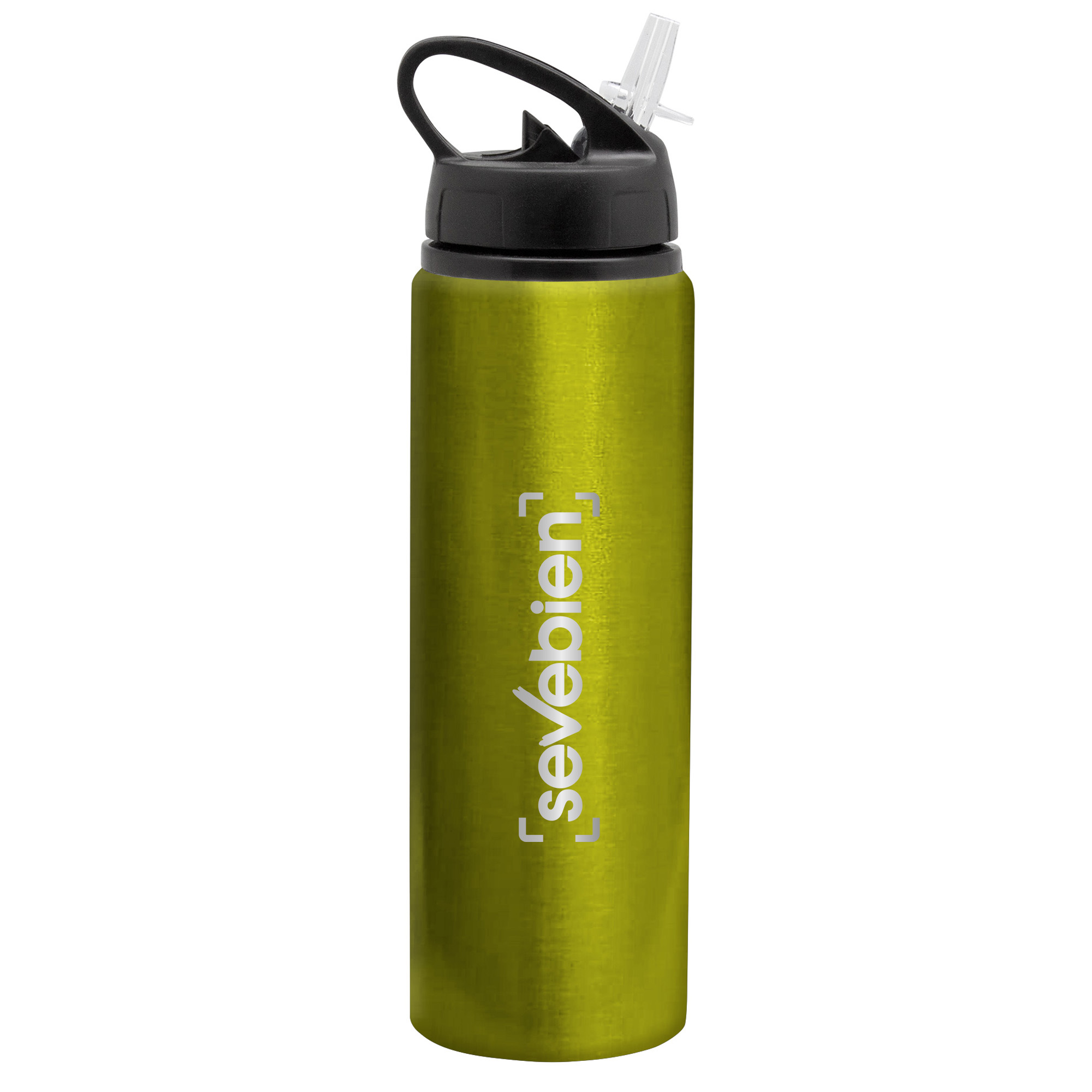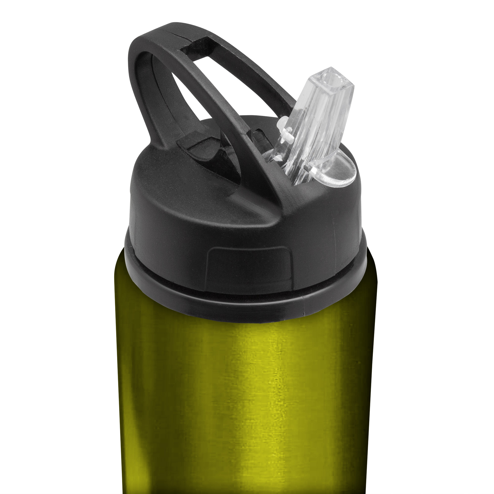 Botella de aluminio con manija de agarre en la tapa, popote plástico y boquilla rebatible. Tapa a rosca de plástico.