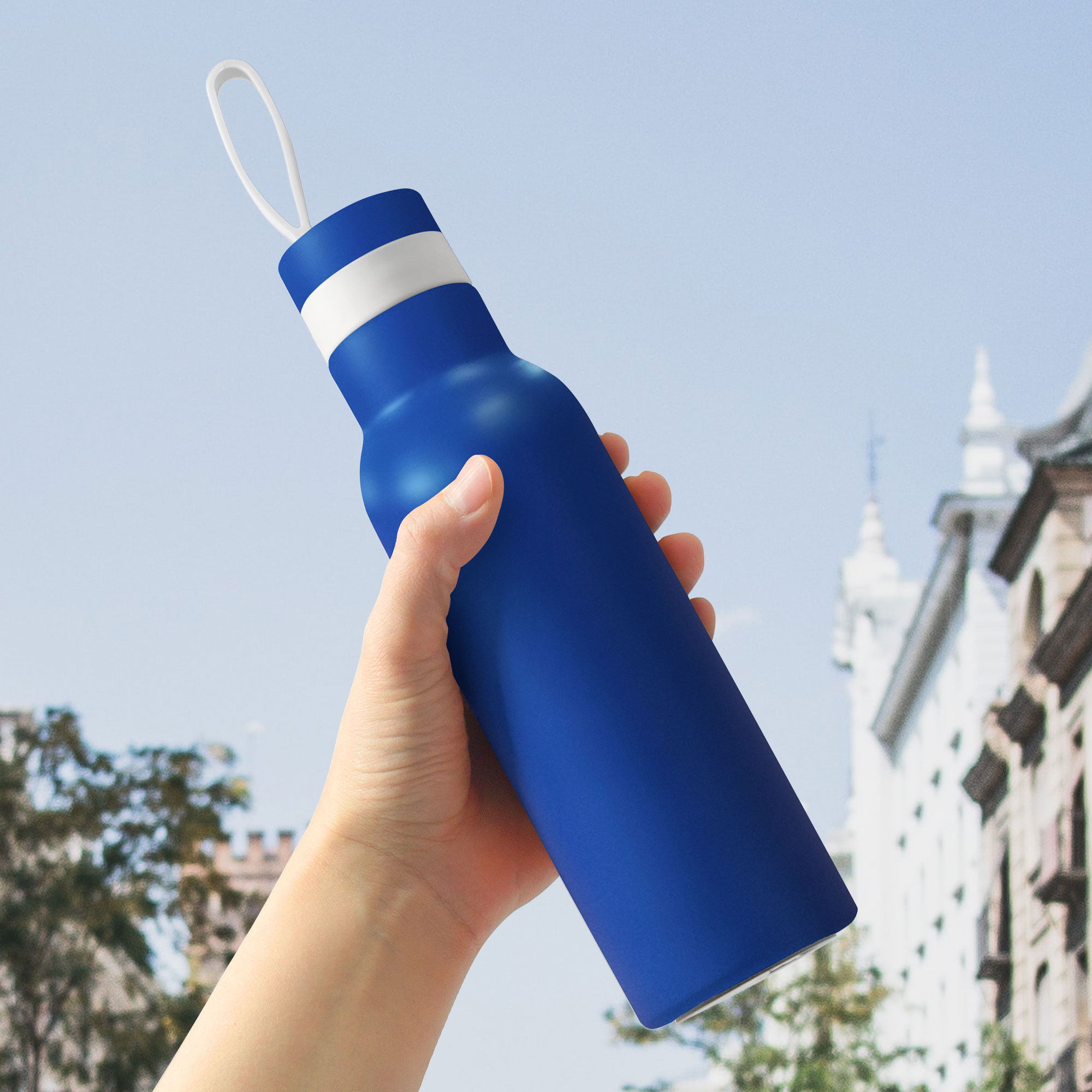 Ø 6,8 x 24,5 cm. Capacidad 500 ml. Acero inoxidable. Botella Vacuum. Interior en acero 304 y exterior en acero 201. Acabado satinado mate. Detalle de agarre siliconado gris.. Mantiene hasta 12 hs la temperatura de las bebidas calientes y 24 hs de las bebidas frías. Presentación en caja de regalo Kraft.