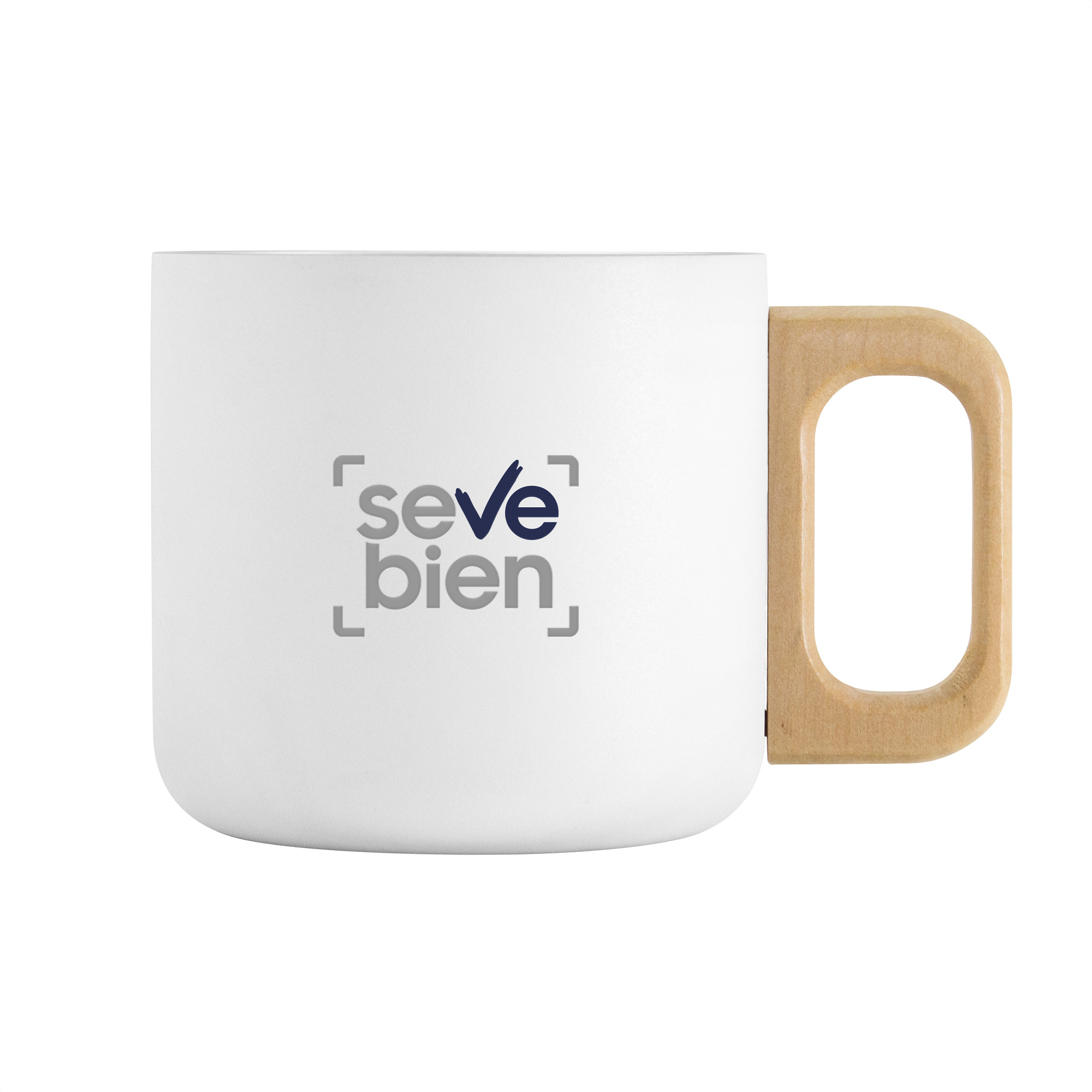 Taza doble pared, sellada al vacío. Interior de acero 304 y exterior de acero 201. Asa de madera color natural. Pintura powder coat (pintura más duradera y resistente a la corrosión y el paso del tiempo). Mantiene las bebidas frías o calientes por más tiempo.