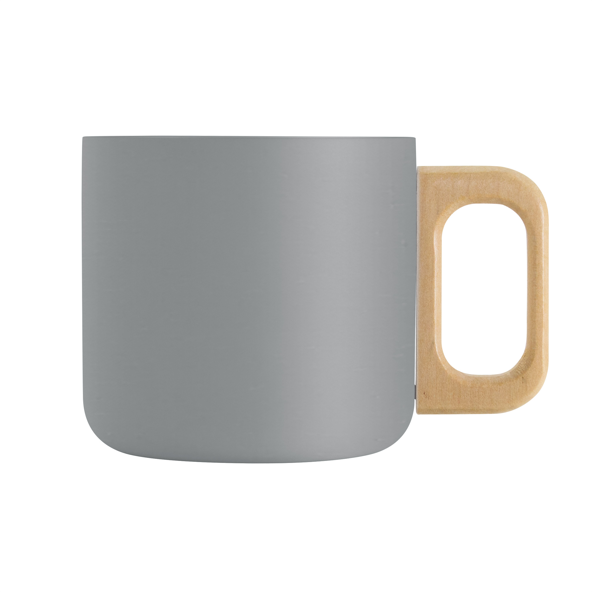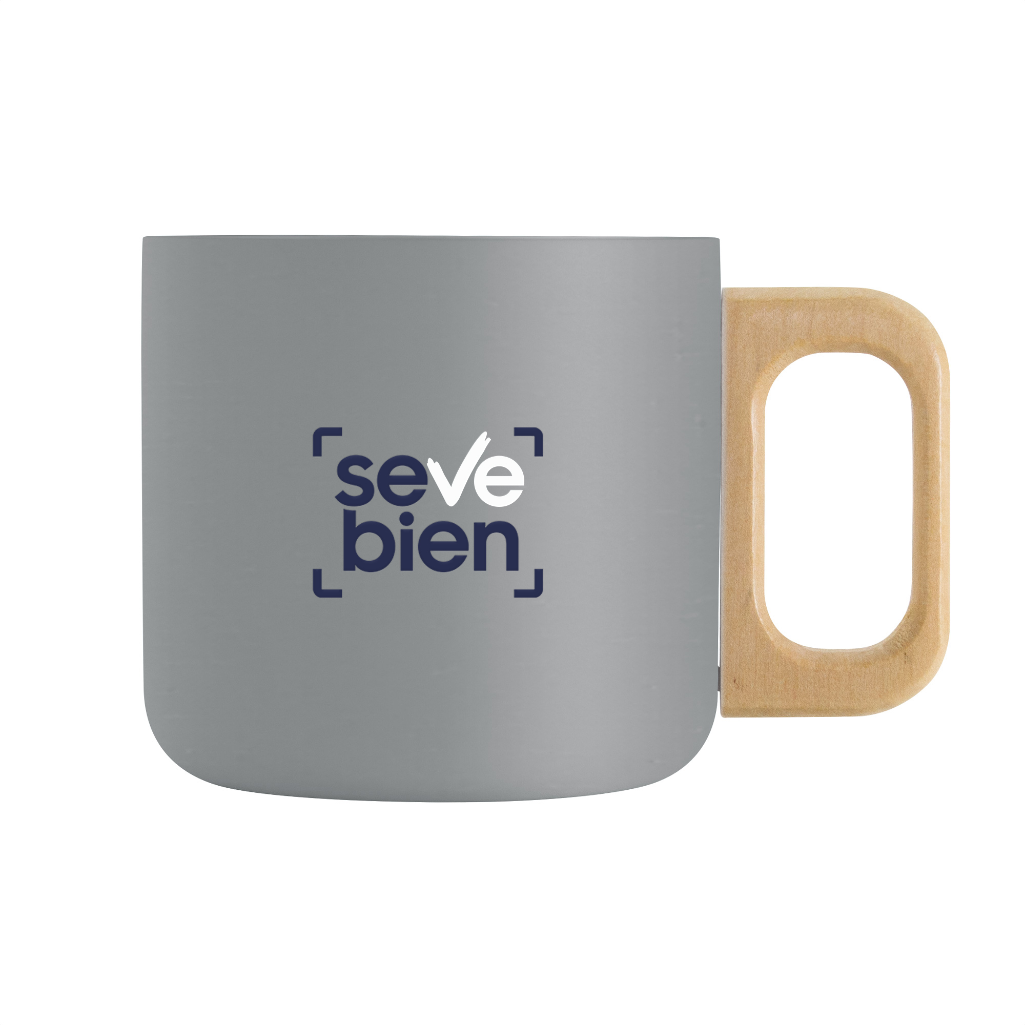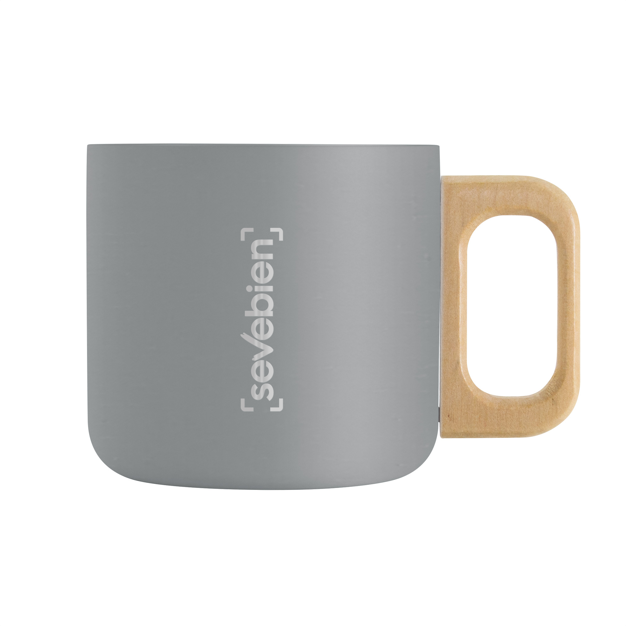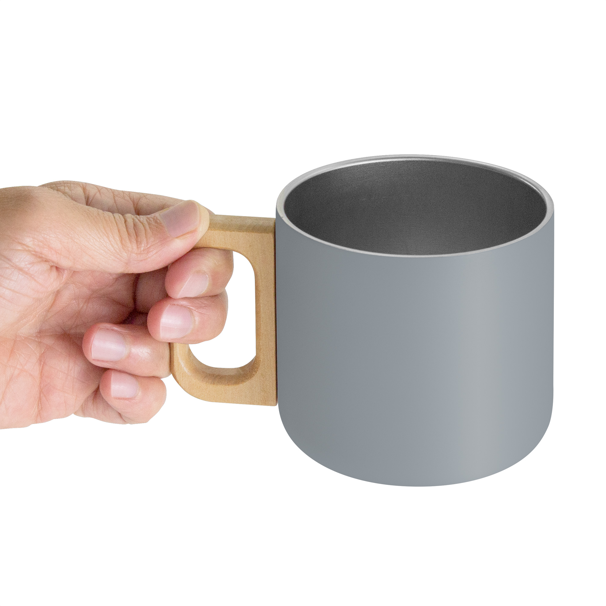Taza doble pared, sellada al vacío. Interior de acero 304 y exterior de acero 201. Asa de madera color natural. Pintura powder coat (pintura más duradera y resistente a la corrosión y el paso del tiempo). Mantiene las bebidas frías o calientes por más tiempo.