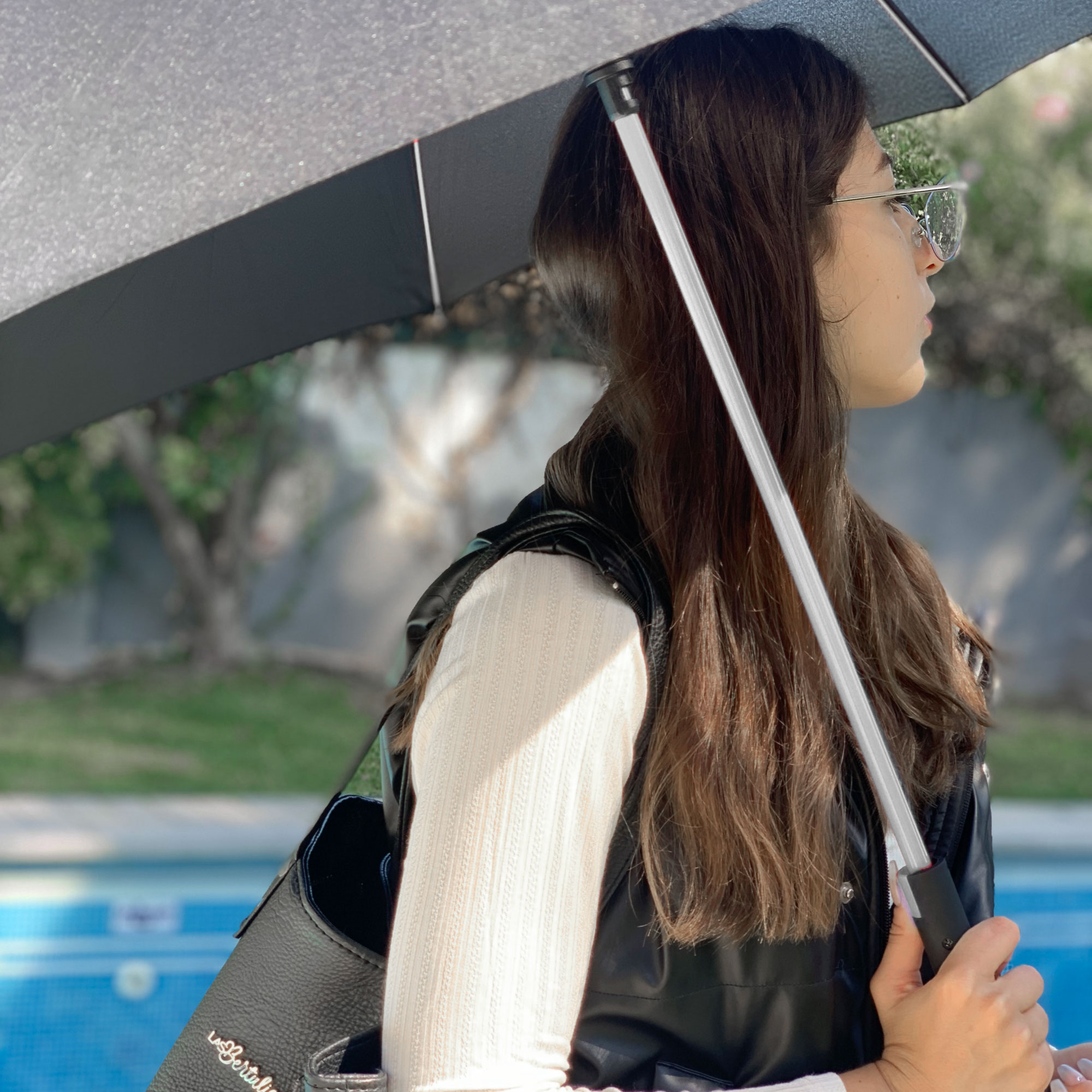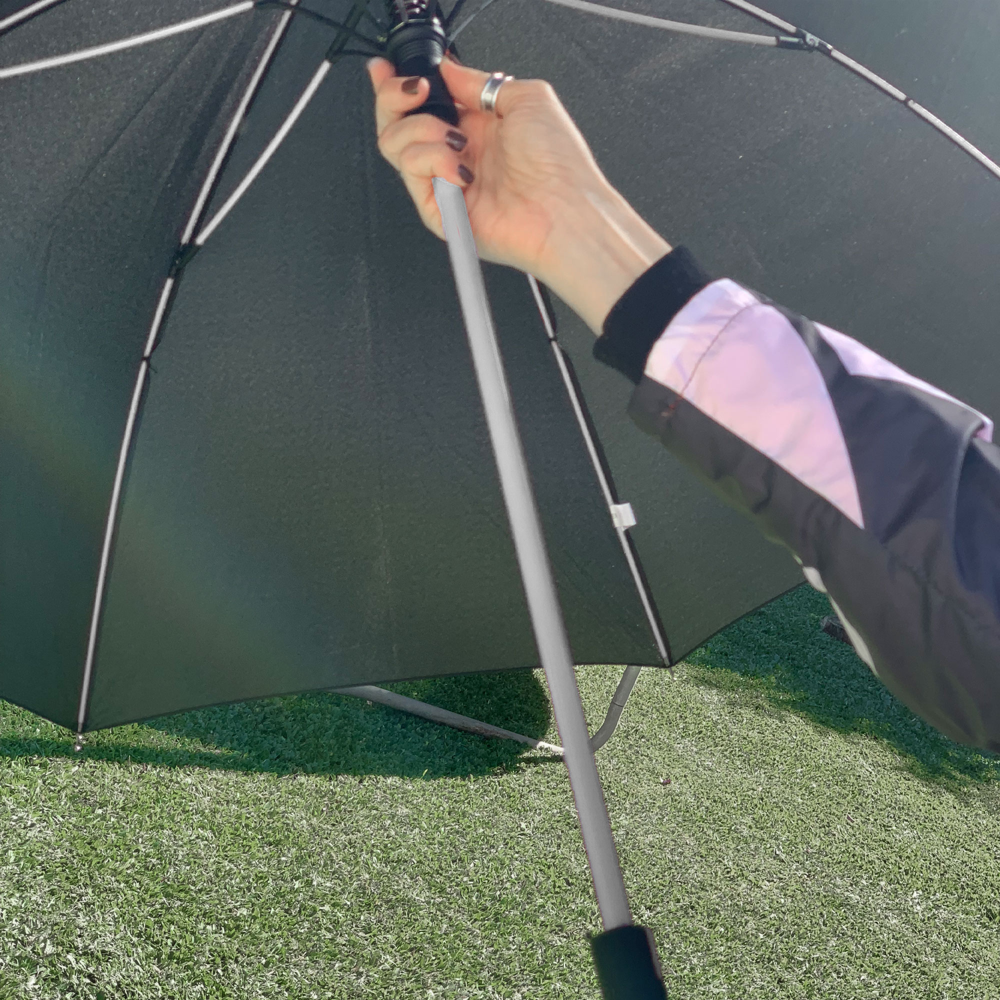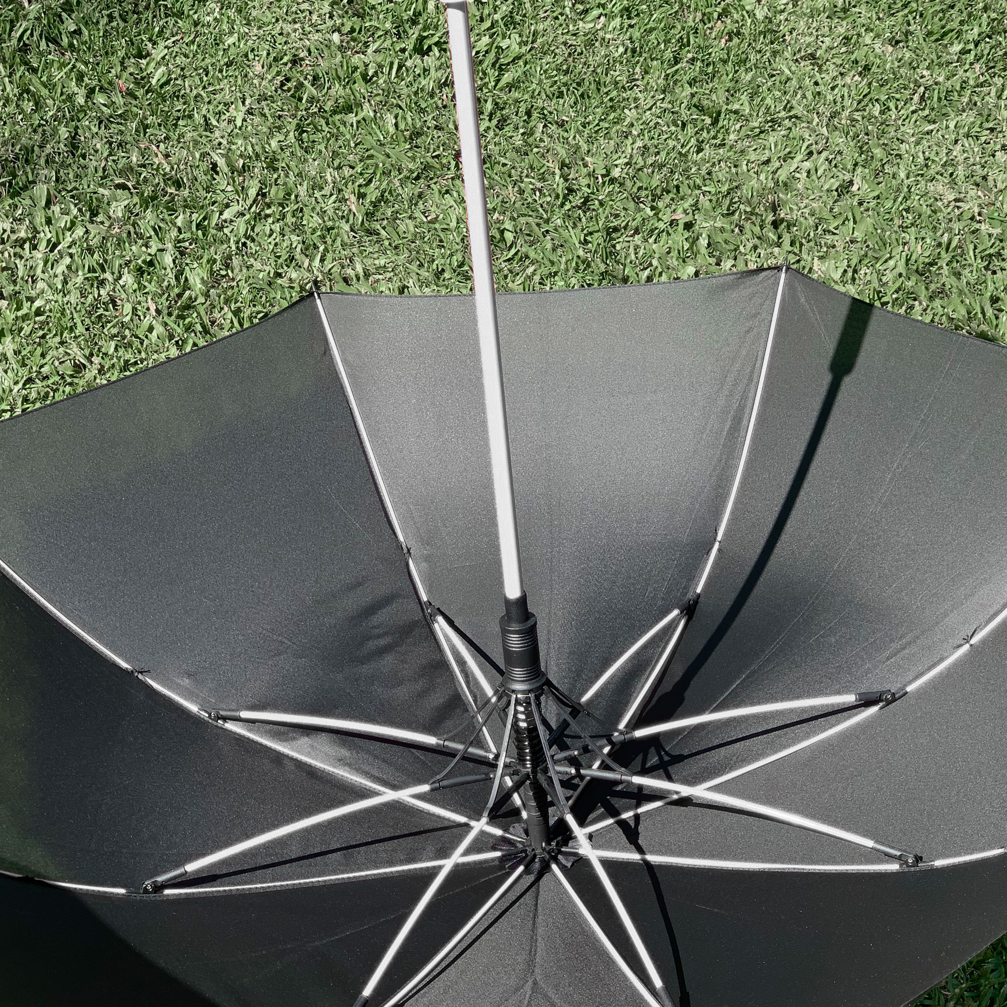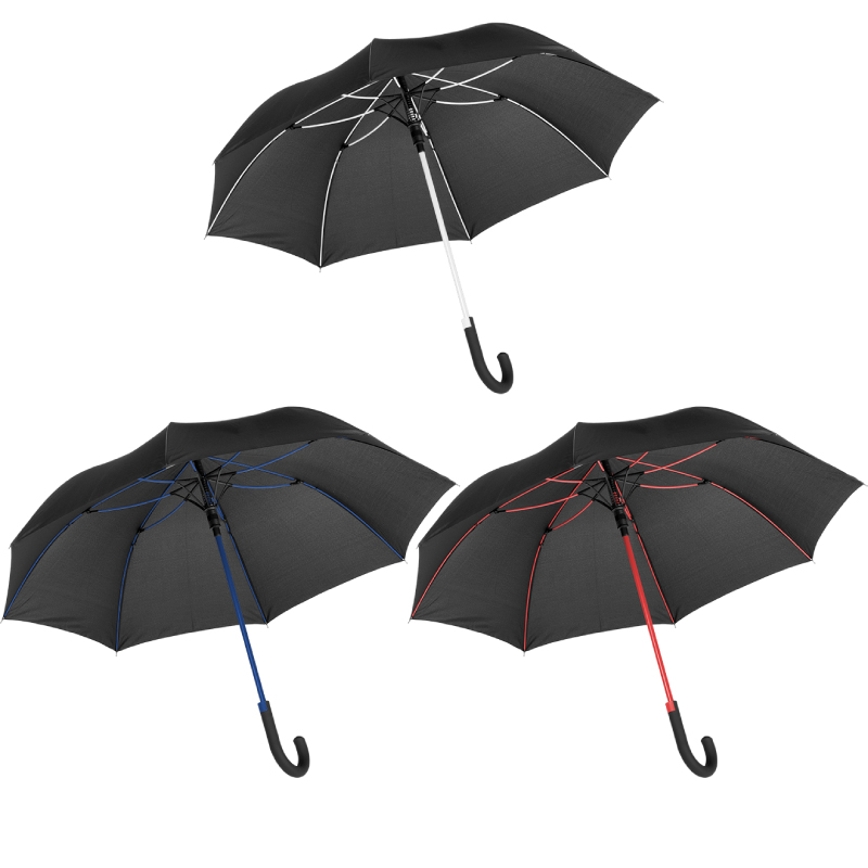 Ø 103 cm. Poliéster Pongee. Paraguas APERTURA AUTOMÁTICA. Eje de metal y varillas de fibra de vidrio de color, puntas metálicas. Mango curvo de goma con botón de color. Cierre con correa de velcro.