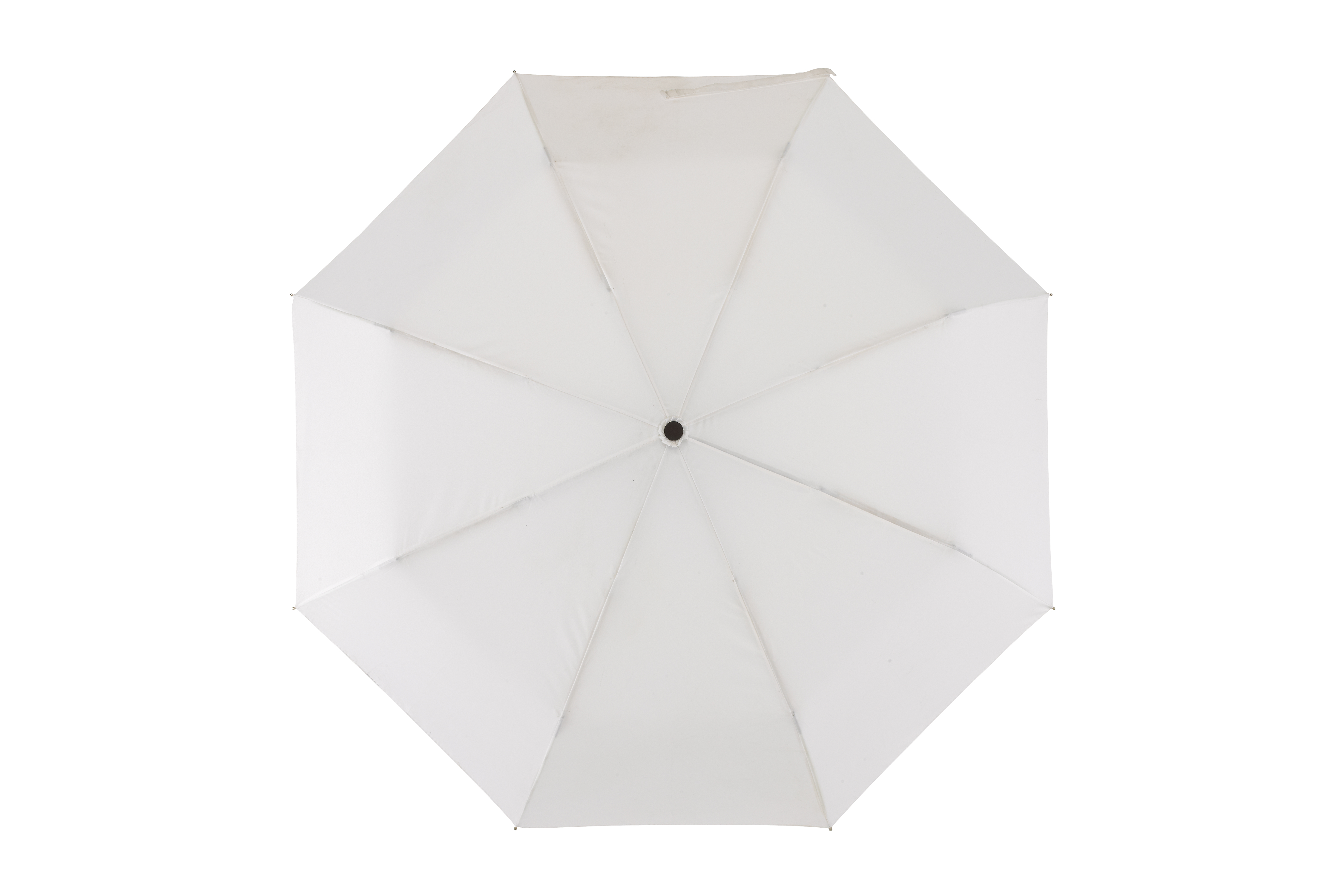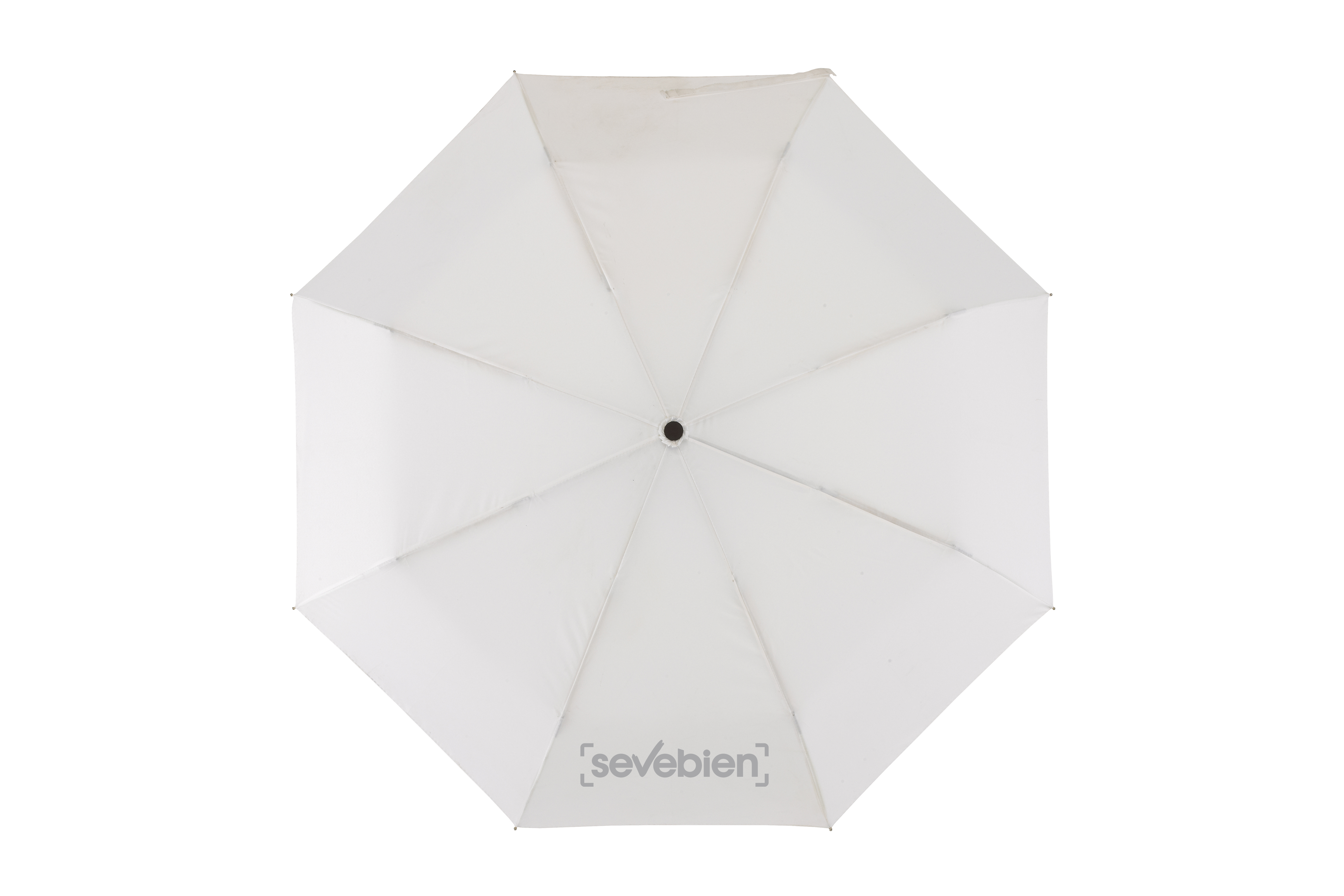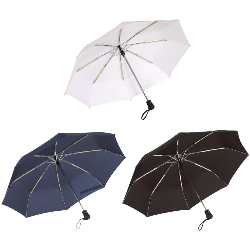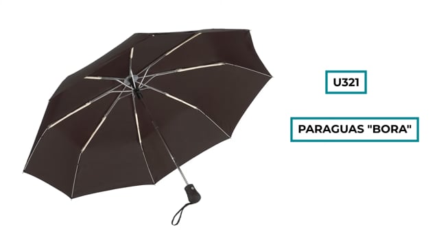 Ø 98 cm. 8 gajos. Ancho gajo 37 cm. Largo cerrado 28,5 cm. Largo abierto 55,5 cm. Poliéster Pongee con revestimiento especial hidrófugo, metal y plástico engomado. Paraguas APERTURA Y CIERRE AUTOMÁTICO. Eje y varillas metálicas. Mango de plástico engomado con correa cordón color negro. Botón a presión. Cierre con correa de velcro.